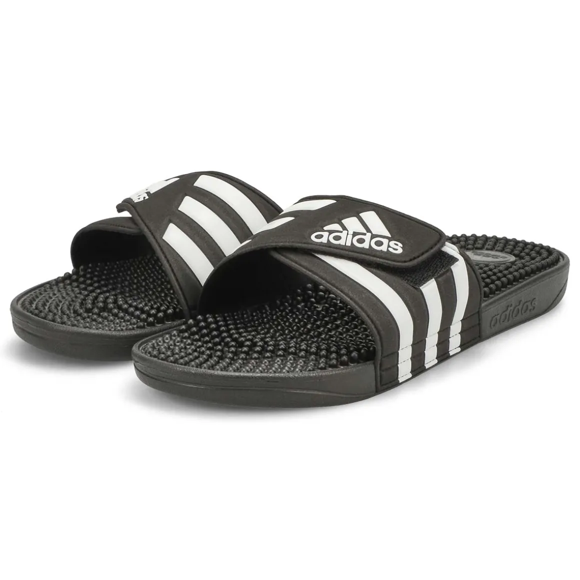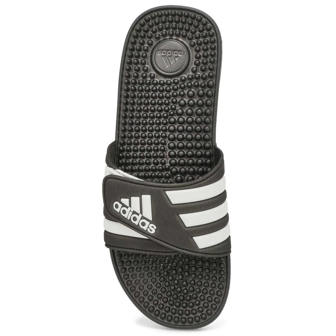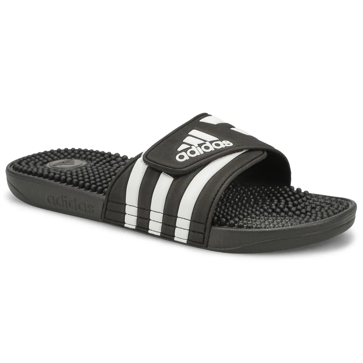 Like a spa for your feet, the Adissage black/ white slide sandal from Adidas have massage nubs on the footbed that soothe and relax tired muscles. The adjustable bandage upper dries quickly and features 3-Stripes and an adidas Badge of Sport. An EVA outsole offers lightweight comfort. You will want to add Adissage to your must-have list for your wardrobe this season!
