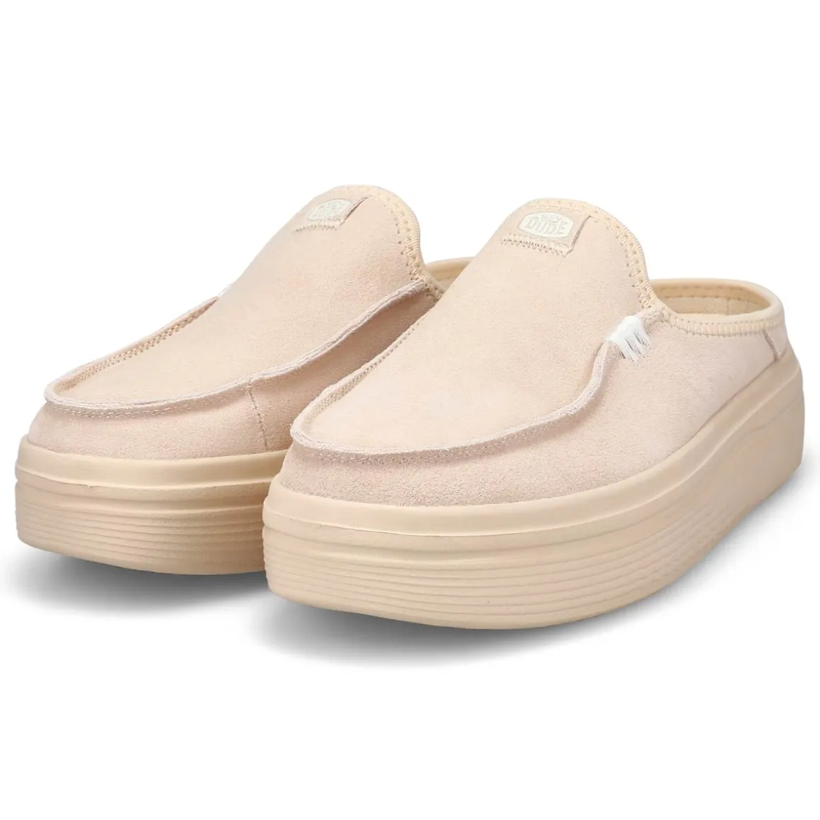 Step into elevated comfort with Austin Lift tan platform shoe from HEYDUDE. Inspired by trendsetters like Sydney Sweeney, these slip-ons are perfect for that bold, stylish look your seeking this season. Featuring a soft suede uppers with a moc-toe stitch, cushioned footbed for comfort, and raised back heel edge keeps your foot feeling secure for a snug fit.