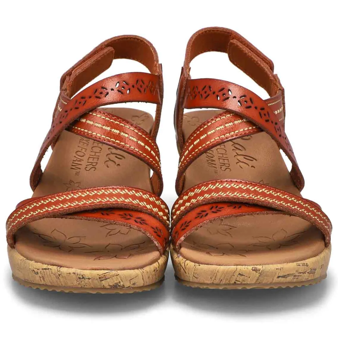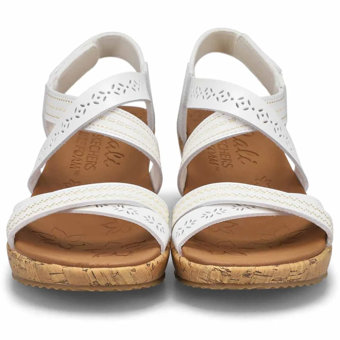 Bring the fierce style with you everywhere wearing the Beverlee Delicate Glow wedge sandal from Skechers. Embroidered synthetic upper in a wedge heeled fashion strappy slide sandal with cork wedge heel and Luxe Foam footbed. Criss crossing slide straps for comfort and coverage. Natural cork veneer wedge midsole with a flexible traction outsole.