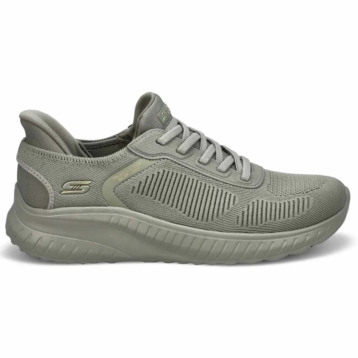 Step into athletic style and comfort wearing the Hands Free Slip-ins: BOBS Sport Squad olive Sneaker from Skechers. Designed with Skechers’ Exclusive Heel Pillow that helps hold your foot securely in place. This fashion style features an engineered knit upper with stretch laces and a cushioned Skechers Memory Foam comfort insole.