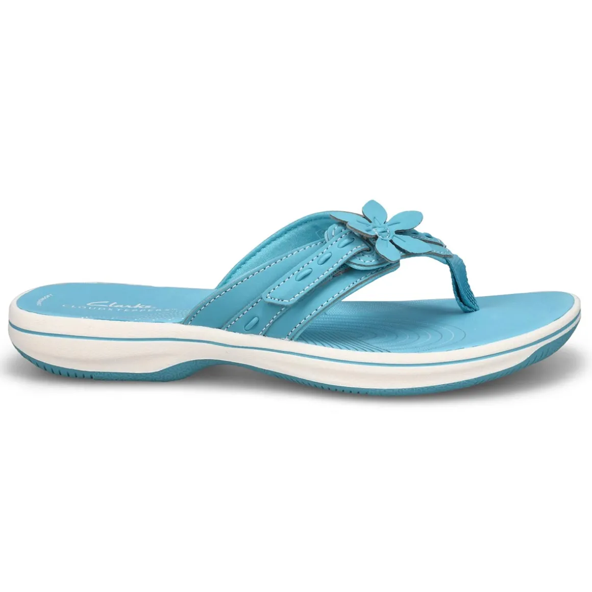 Topped with a pretty flower detail, the Breeze Opal sky blue thong flip-fllop sandal from Clarks is part of their Cloudsteppers collection, so you know that total underfoot comfort is a sure thing. It’s crafted with soft synthetic uppers for a skin-gentle feel, while grippy soles make for confident support and easy-breezy steps.