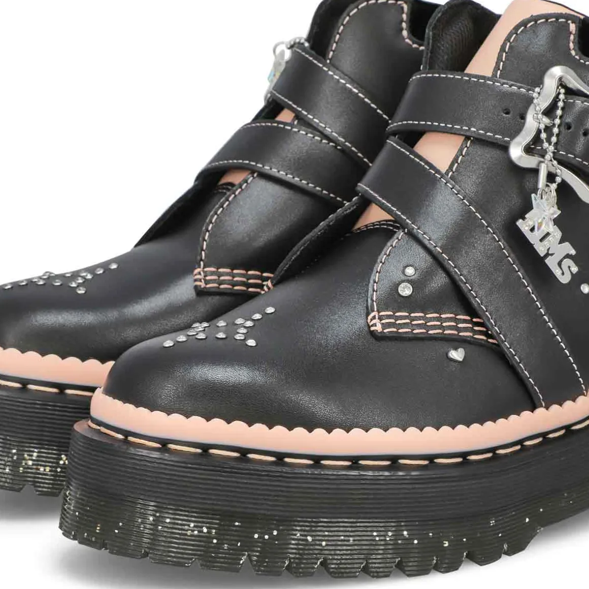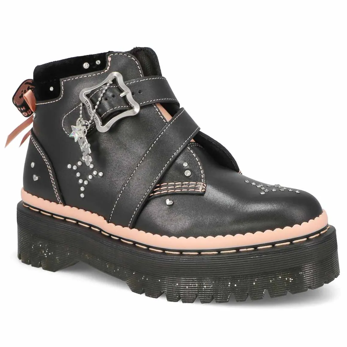 A customisation mashup. The Caitie black/ powder pink ankle boot from Dr. Martens is covered heel to toe with playful details and bursts of colour. A shiny silver buckle, Dr. Martens branded charm, velvet ribbons, embroidery, and diamante detailing. With padding around the ankle and a statement pink tongue. The platform Quad sole is infused with glitter, secured with powder pink welt stitching, and detailed with a powder pink scalloped rand.