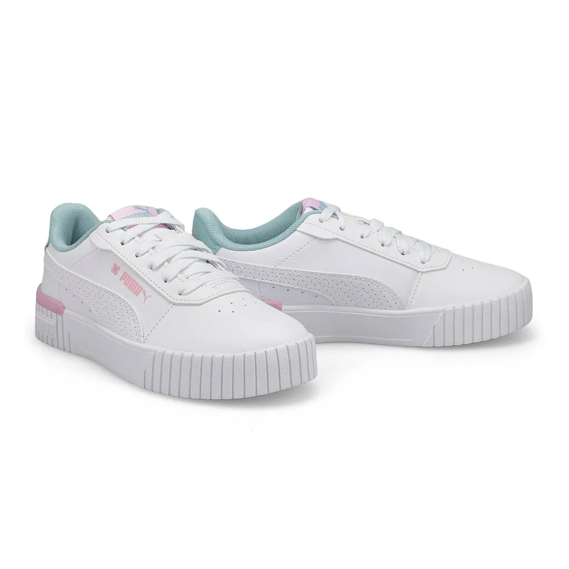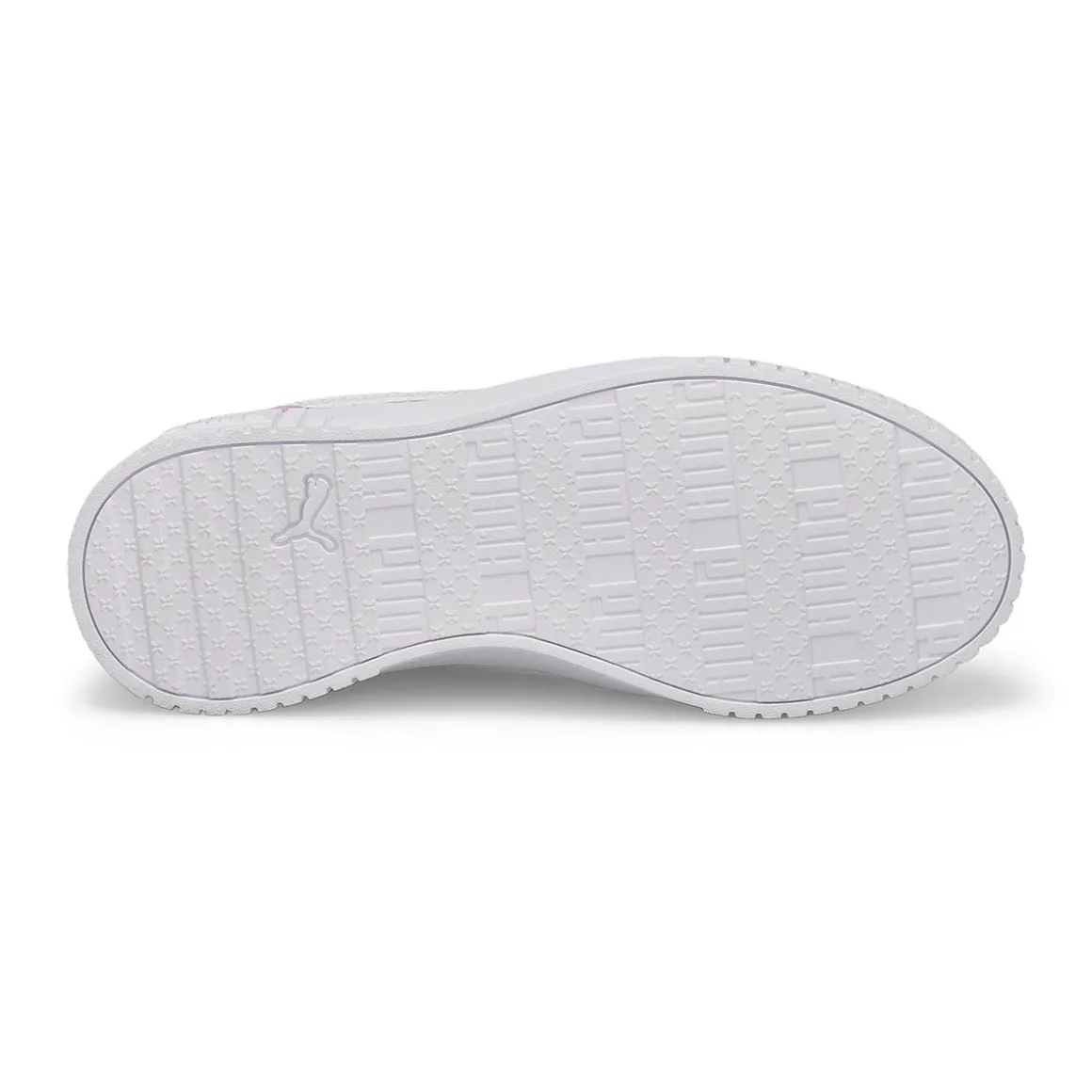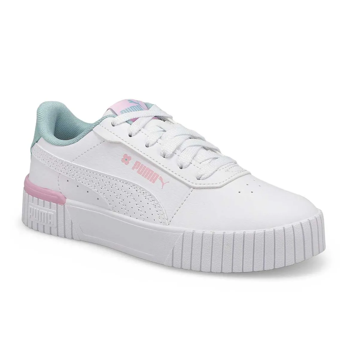 The Carina 2.0 Jr sneakers by Puma are inspired by styles from the 80s, in a new tennis silhouette interpreted to fit today’s laid-back sneaker look of Californian beach towns. This new edition keeps the familiar look and feel but updates with meaningful and commercial refreshments such the new tooling design. Wider vertical lines as well as a Puma logo on the heel add a young, street look. The synthetic leather upper is accented by a perforated vamp and the well-known Puma Formstripe. The SoftFoam+ sockliner provides superior cushioning and optimal comfort for every step of your child’s day.