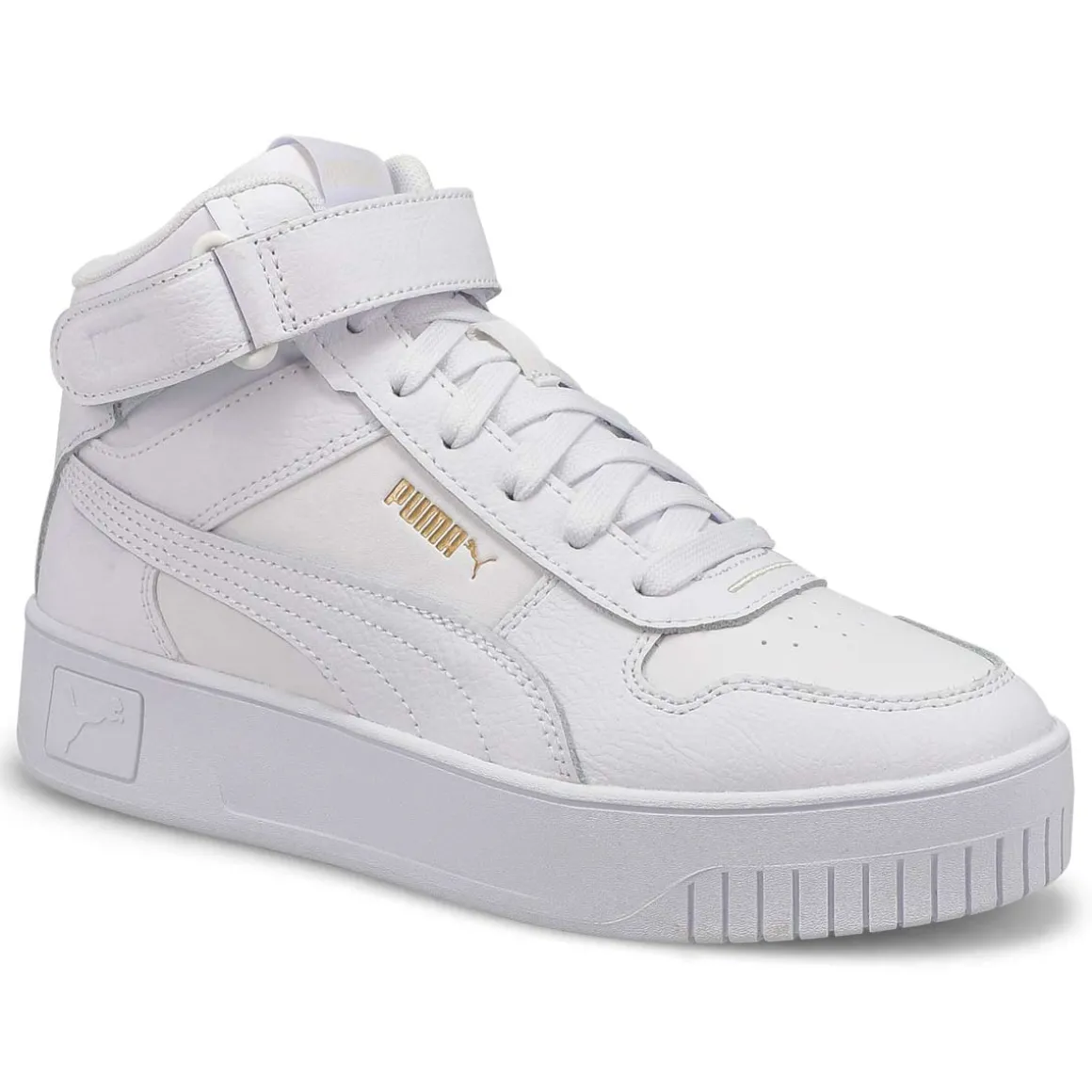 The Carina Street Mid white/ gold sneaker from Puma features a streetwear-inspired design and a slightly elevated platform, making them your perfect choice for casual, everyday outfits. Upper of this shoe is made with at least 20% recycled materials as a step toward a better future. SOFTFOAM+: Step-in comfort sockliner designed to provide soft cushioning thanks to its extra thick heel.