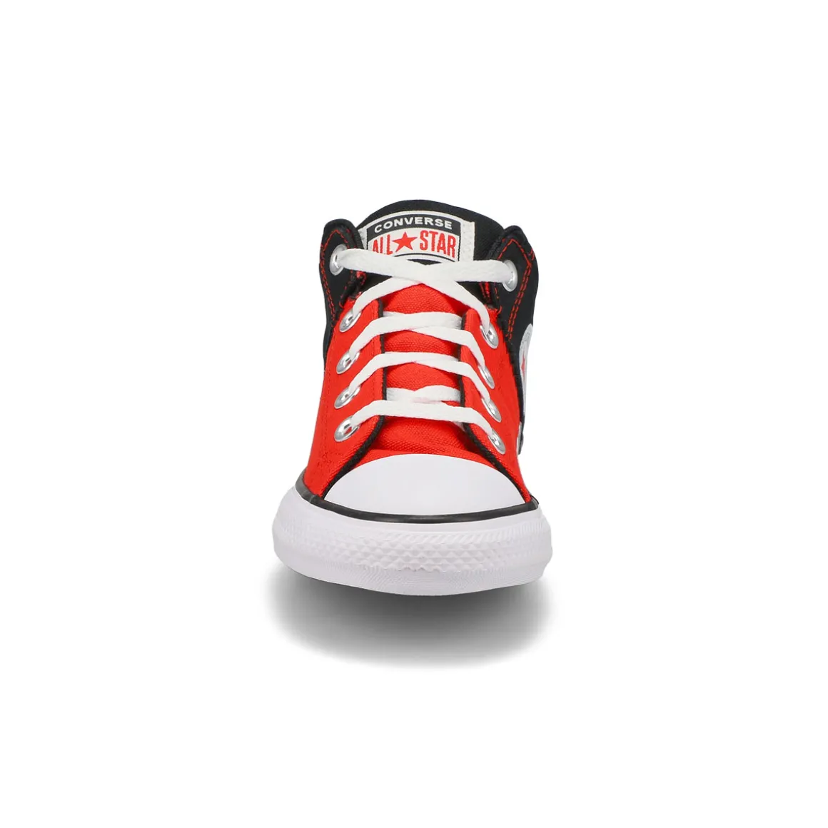 Cushioned details with a flair for the dramatic, the red/black/white Chuck Taylor All Star Axel by Converse amps up the iconic chuck silhouette. Featuring a durable canvas upper, and a soft, kid-friendly lining. The All Star Axel Mid sneaker is designed with fixed laces and a gored tongue allow for easy on and off.
