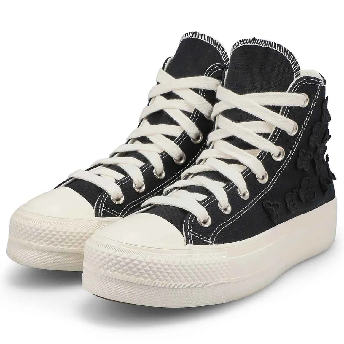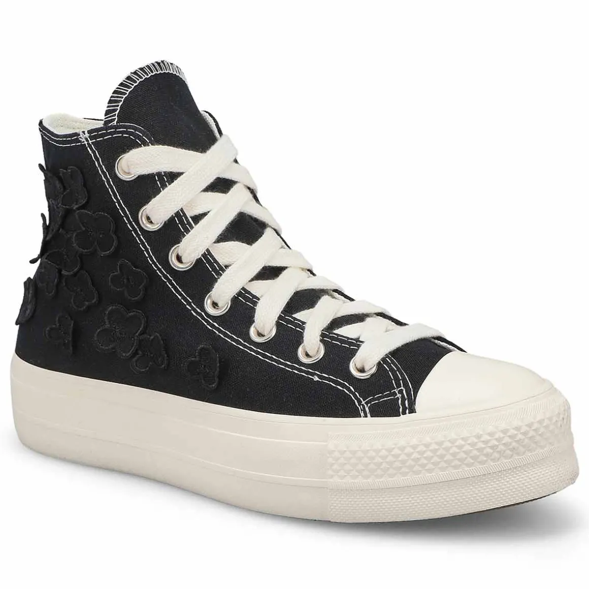 The Chuck Taylor All Star Lift Flower Play Hi Top Platform sneaker in black/black from Converse features a stacked platform sole ups the height, while iconic features stay true to the original. The Staple for everyone’s wardrobe. The Hi Top legend since ’57. The Chuck Taylor All Star Hi Top black sneaker keeps it classic. With the iconic elements we have all come to love like a cushioned insole and canvas upper keeping it comfortable. You got it with this iconic silhouette.