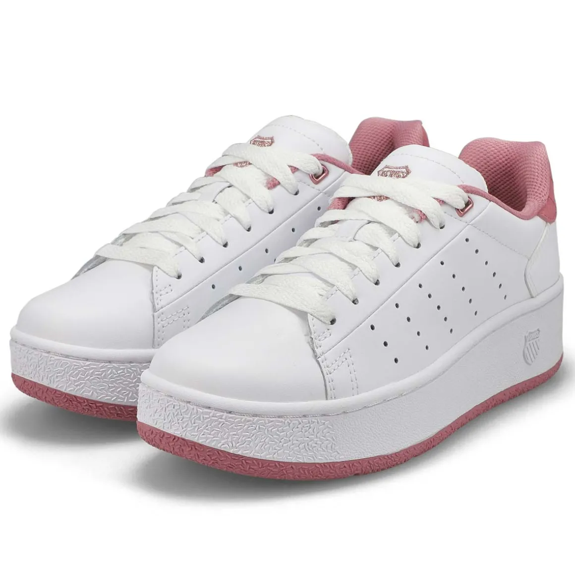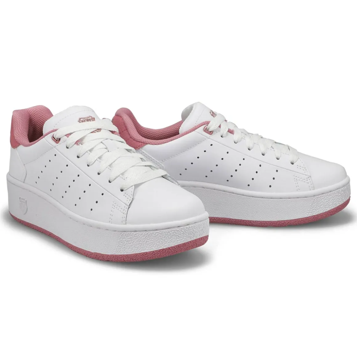The Classic PF Platform white/ floxglove sneaker from K-Swiss is an elegant and sophisticated take on sportswear styling. With a sleek and clean upper design over a fashion forward heritage inspired platform outsole, the Classic PF Platform sneaker has a bold look while being easy to wear with any outfit.