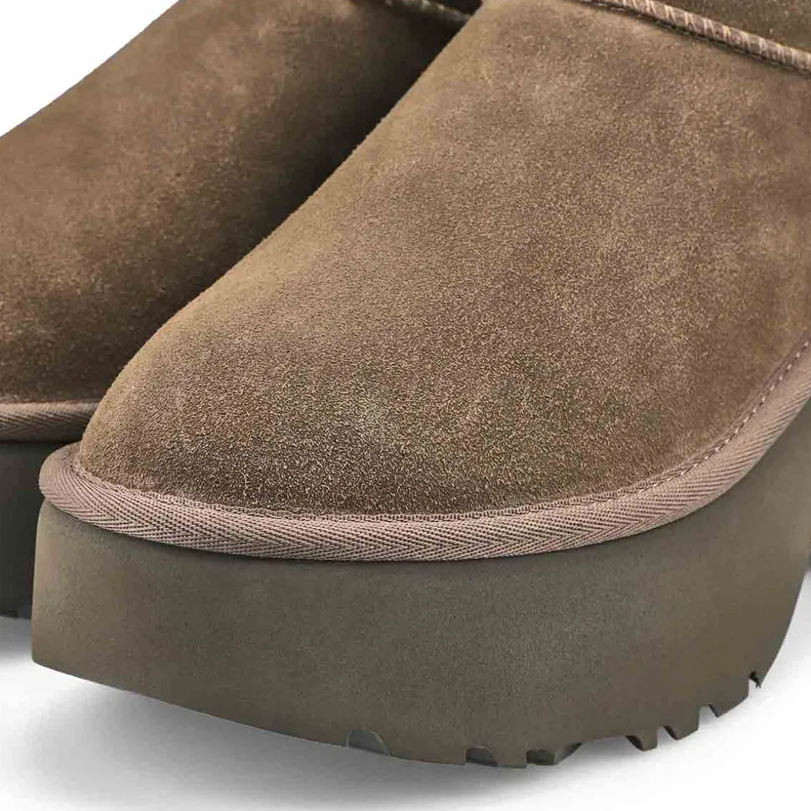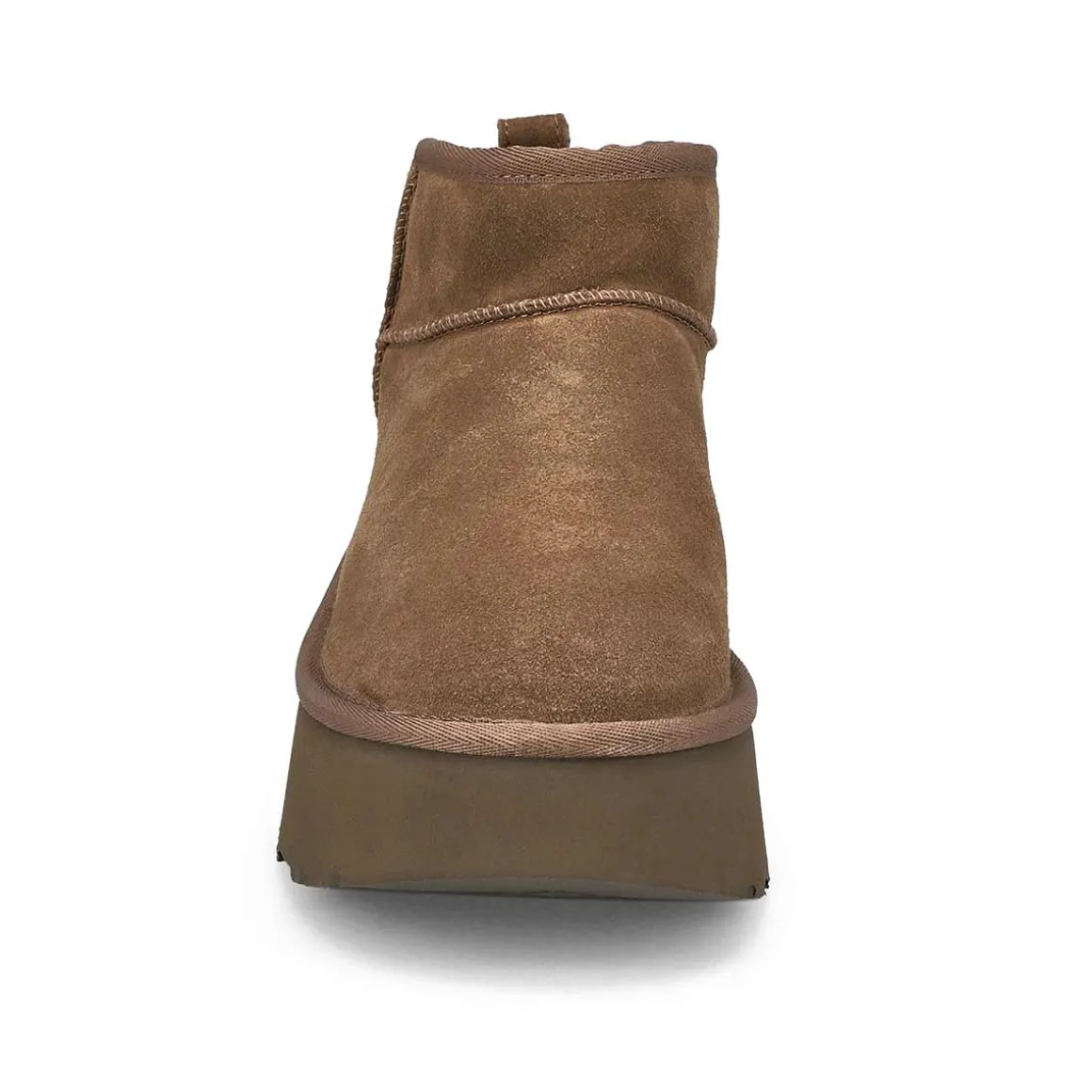 Lean into sky-high vibes with the Classic Ultra Mini New Heights chestnut boot from UGG. Designed with UGG’s suede upper, UGGplush lining, and a bold cropped shaft. Textile binding made from 100% recycled polyester fibers This Classic Ultra Mini gets a bold new update with a chunky notched platform and a 2.75 icnh heel.