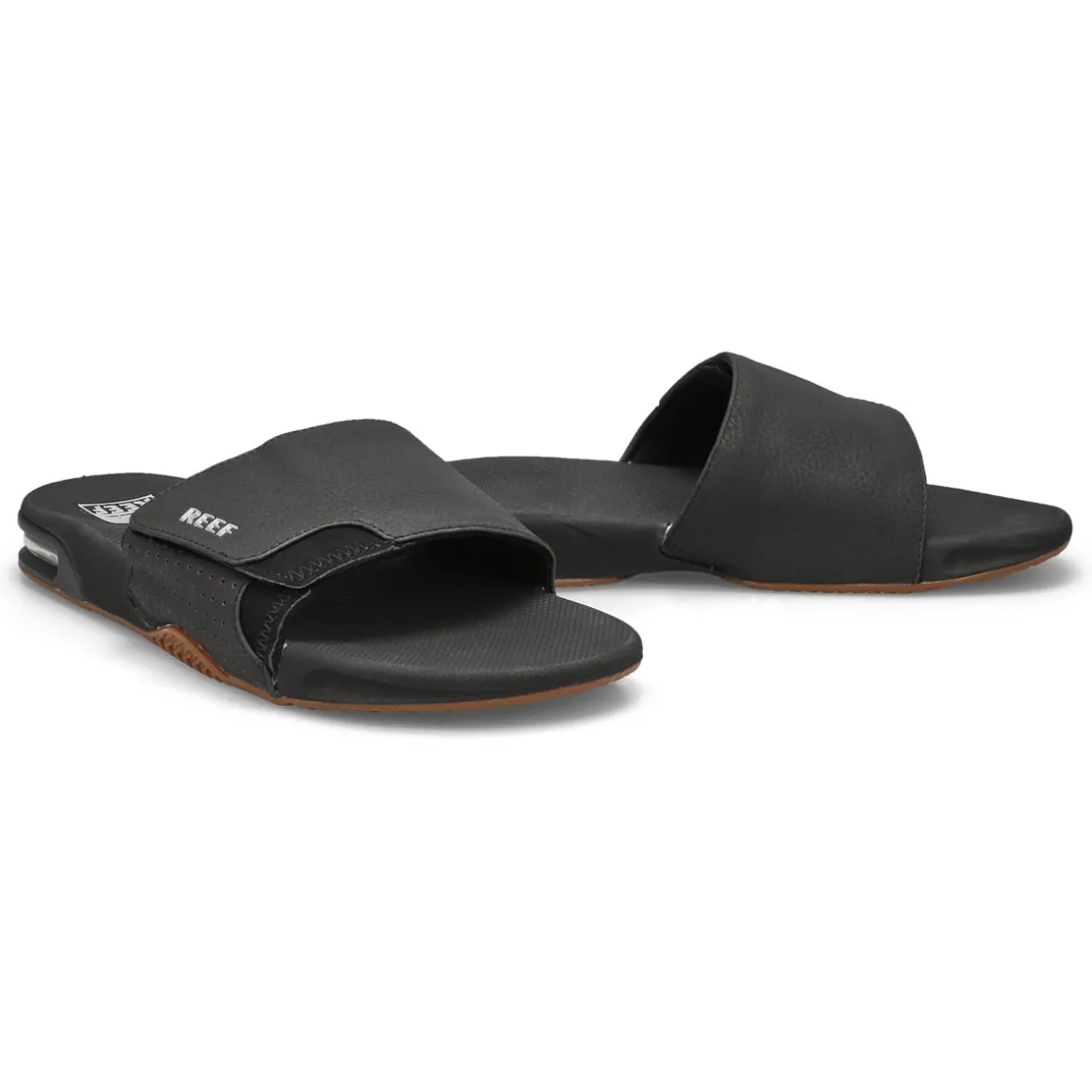 The Fanning black/silver slide sandals from Reef are a classic staple of supreme beachside style! Water-friendly synthetic upper. Contoured compression molded EVA footbed with anatomical arch support. Full 360 degree heel airbag enclosed in soft polyurethane. Church key to open your “soda” bottle. Reef icon herringbone rubber outsole design.