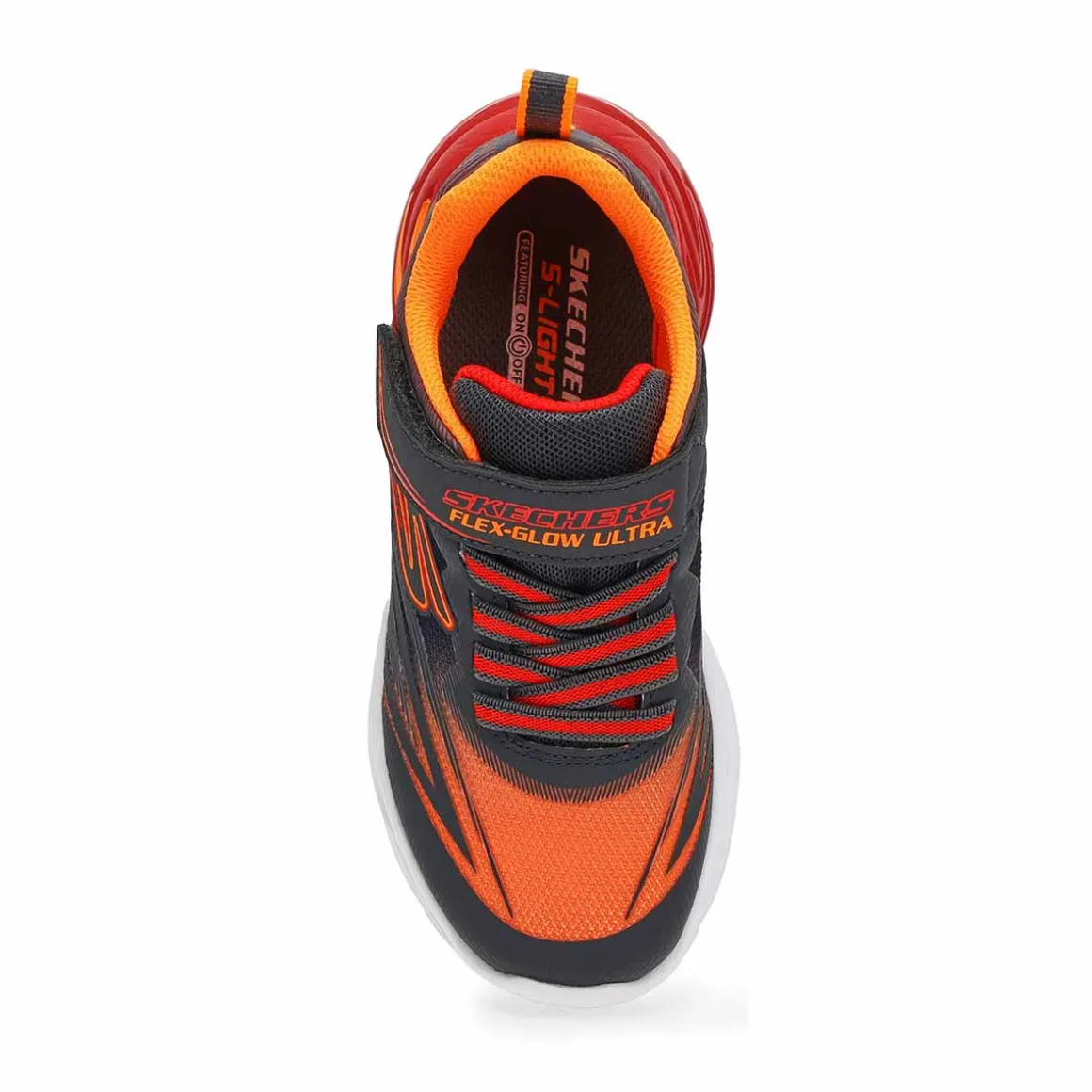 Rev up their day with the bright fun of Skechers S-Lights Flex-Glow Ultra black/ silver lace up sneaker. This colorful sneaker features an ombre mesh upper with synthetic overlays, fixed stretch laces and Adaptive Closure, plus a tech-pieced light-up midsole. Tech-pieced light-up midsole. Cushioned comfort insole with a flexible traction outsole.