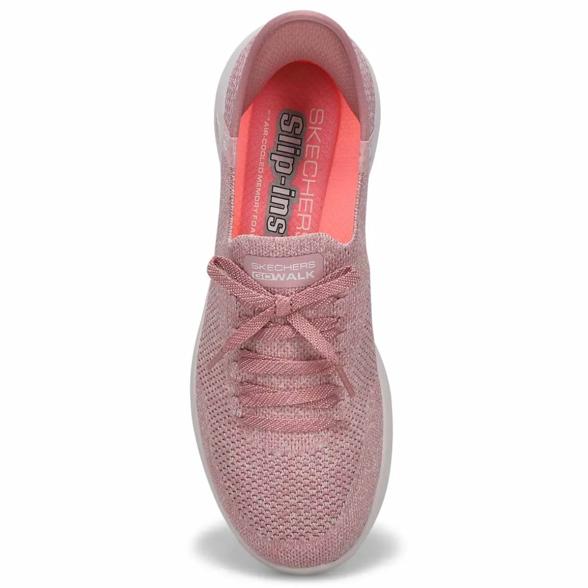 Step up your routine with easygoing comfort wearing the Slip-ins: Go Walk Joy Plush sneakers from Skechers. Designed with Skechers exclusive Heel Pillow whick helps hold your foot securely in place, this fixed laced slip-on style features an engineered mesh upper with a cushioned Skechers Air-Cooled Memory Foam insole and lightweight 5-GEN cushioning.