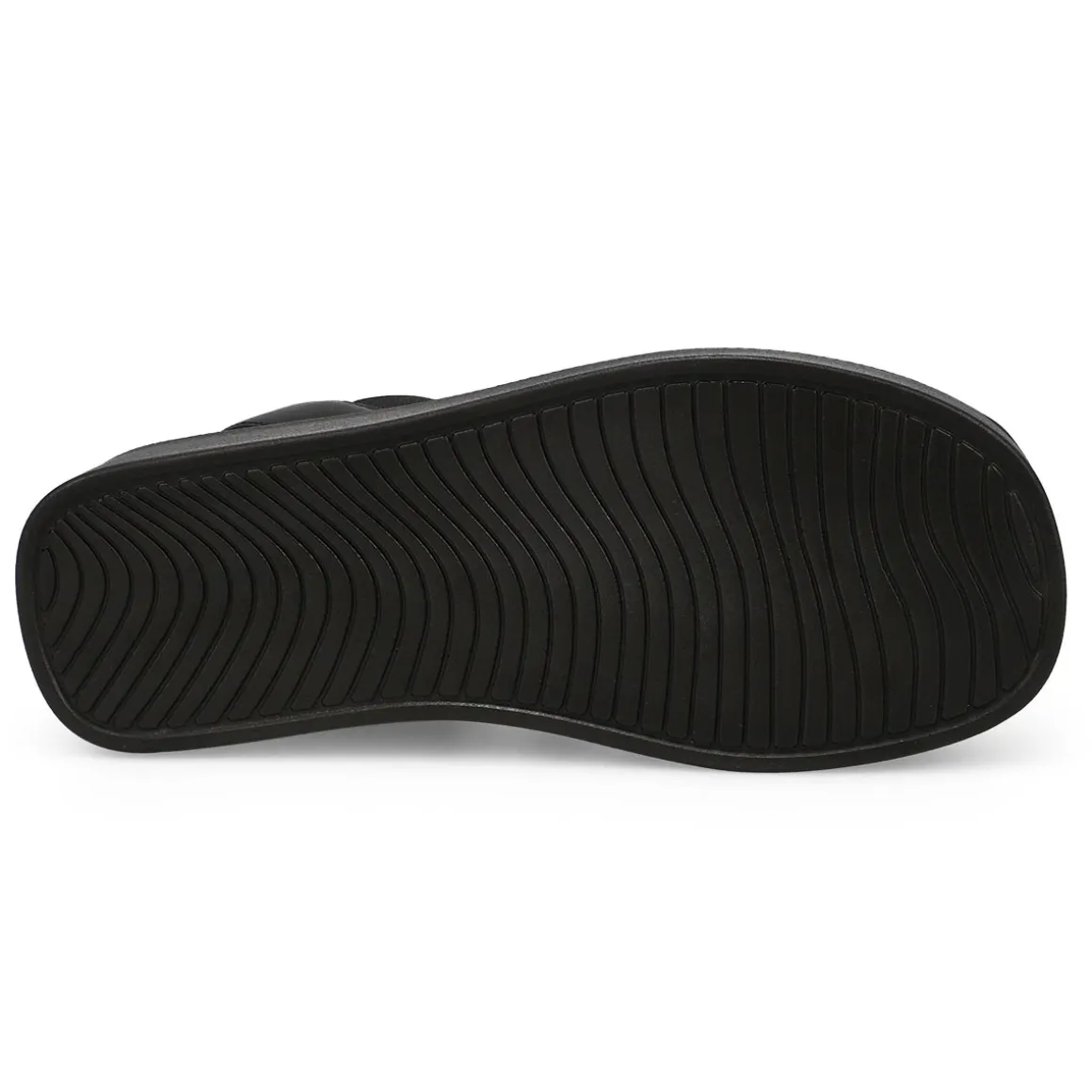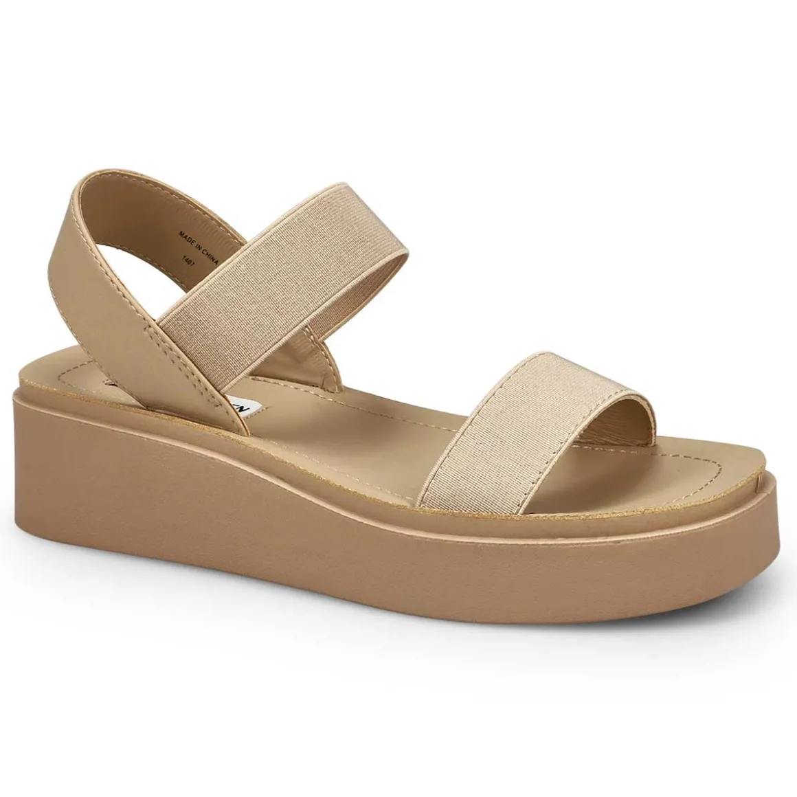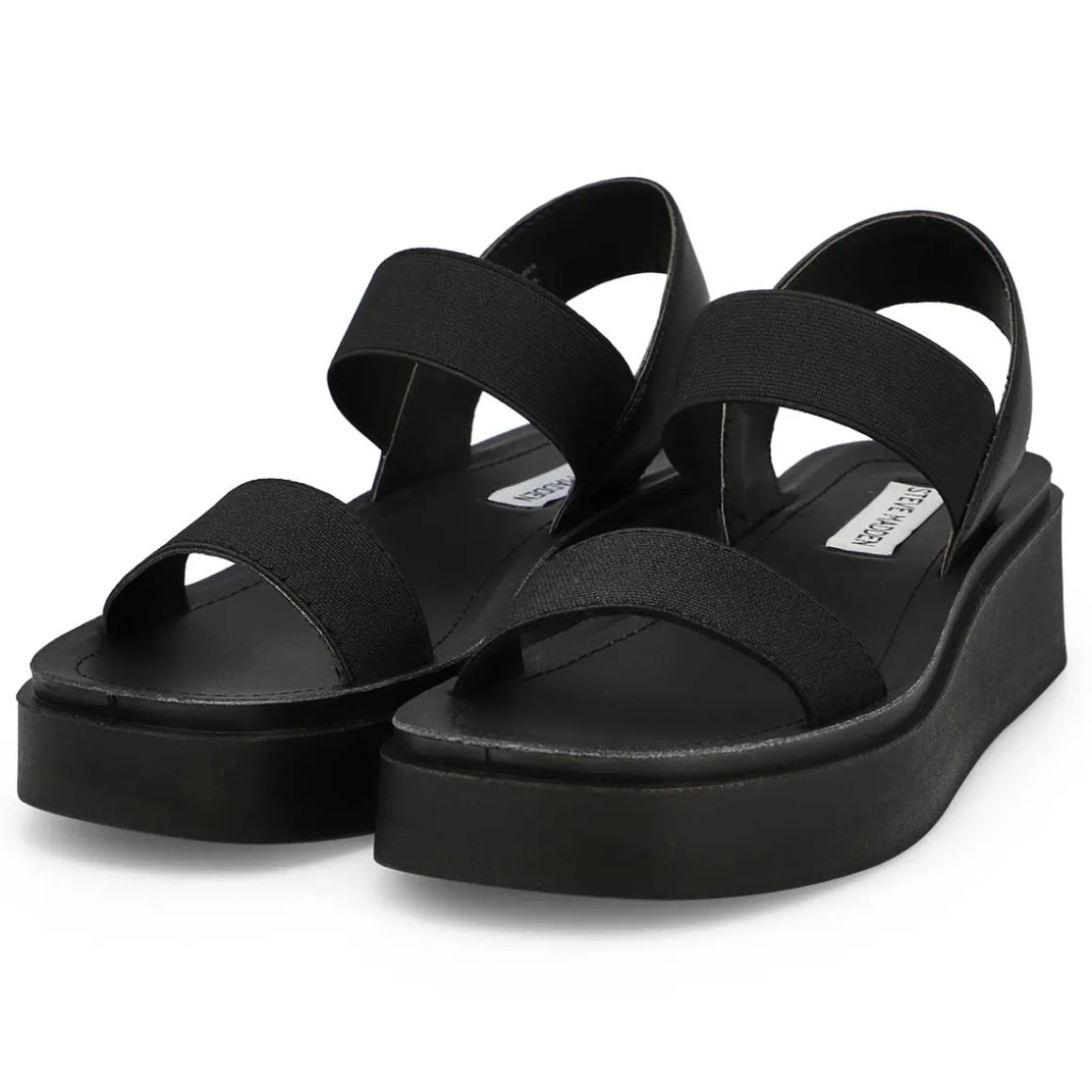Perfectly simple and as classic as they come, the Janice black fashion sandal from Steve Madden features a leather upper with elastic upper material. Slip yourself into this timeless style to complement practically any warm weather look and show off your latest pedi! Platform styling, approx, 1.75 inch heel height.