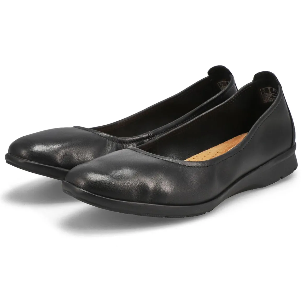 With the striking slender silhouette design, the Jenette Ease Casual black flat from Clarks are sure to bring a contemporary twist to your classic style. Featuring a genuine leather upper with a breathable leather and textile lining. Cushioned insole for all day comfort. A classic round toe styling with a durable synthetic outsole.