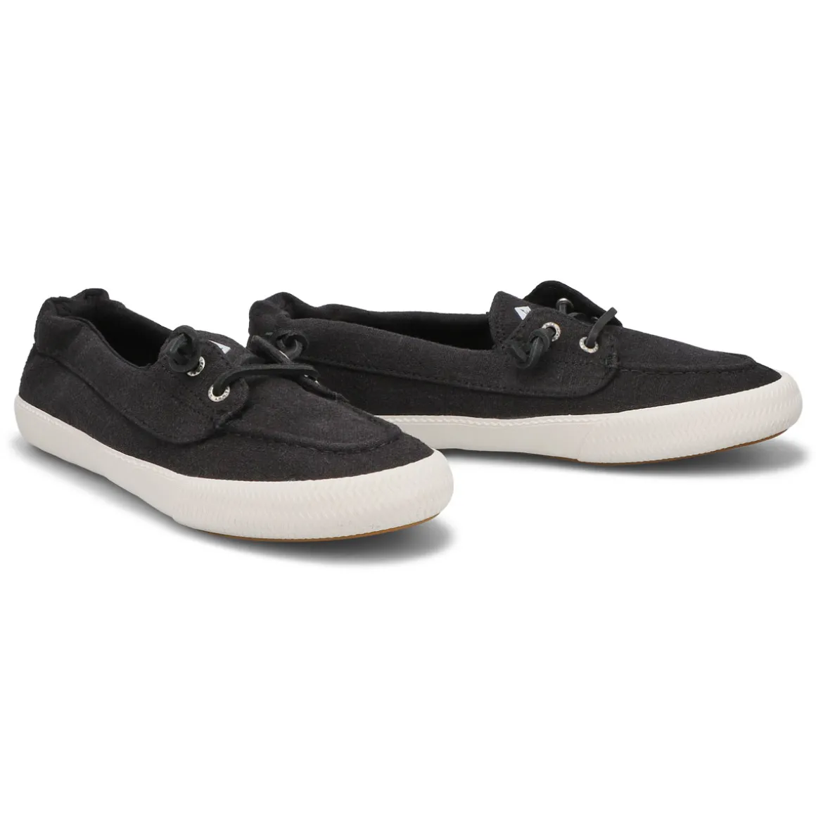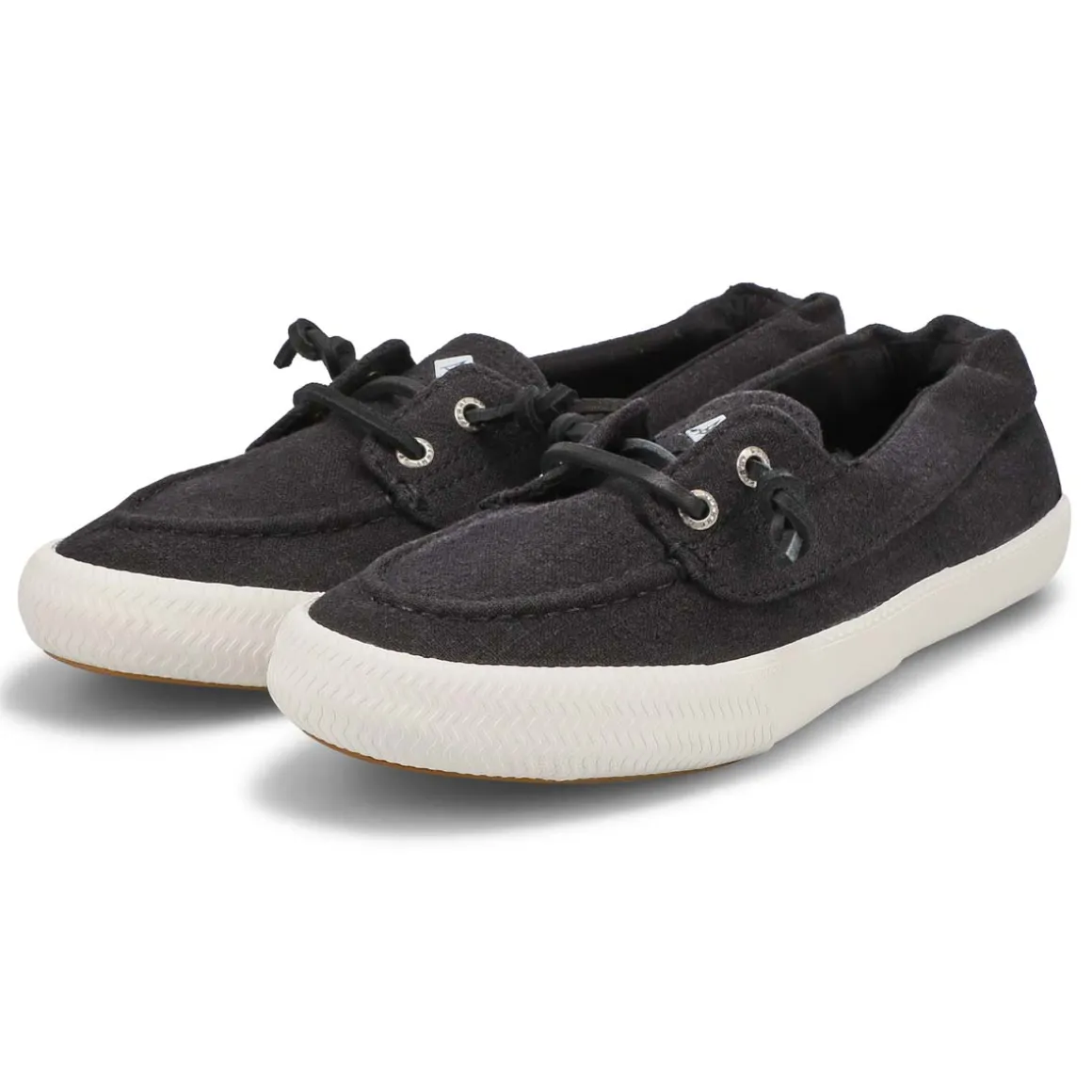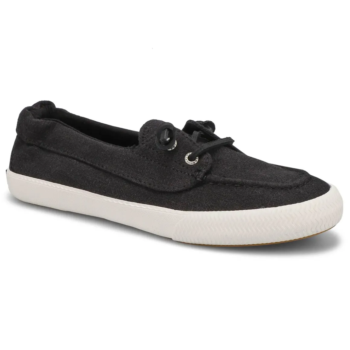 The Lounge Away 2 black boat shoe from Sperry Top-Sider is a boat shoe-inspired slip on that delivers a flexible and relaxed fit. Slip on fit with non functional knotted laces and sparkle textile upper for flair on a classic Sperry styling. Memory Foam cushioned footbed provides comfort and non-marking rubber outsoles deliver added traction.