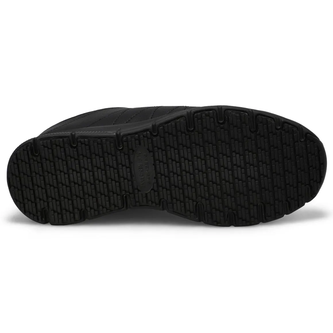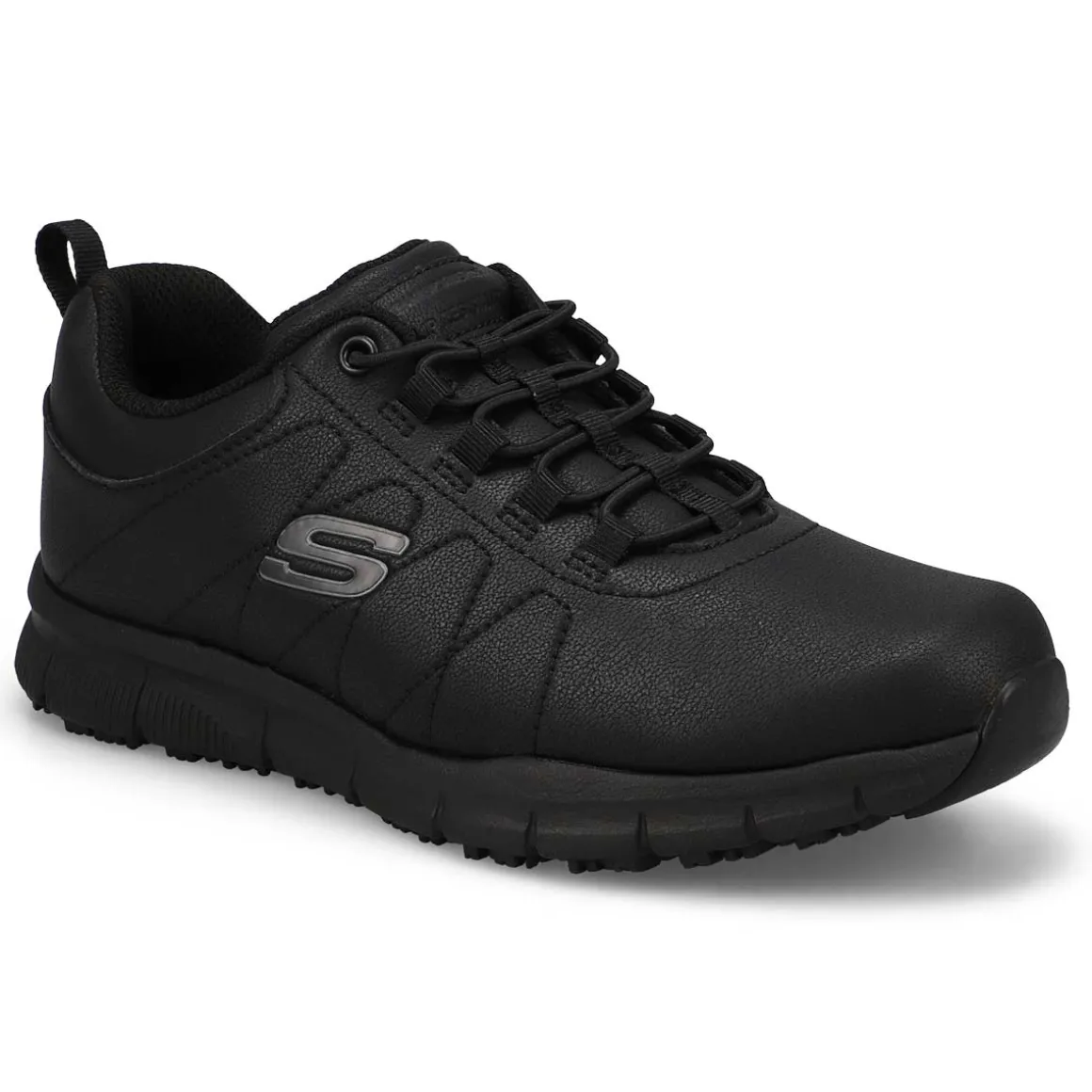 Surefooted comfort and safety combine in the Skechers Work: Nampa – Beja black sneaker. This slip-resistant design features a smooth synthetic upper with stitching detail, stretch laces, and a cushioned Skechers Memory Foam insole. Slip-resistant traction outsole. Electrical Hazard (EH) safe design tested ASTM-F2892. Shock-absorbing flexible lightweight midsole. Skechers logo detail.