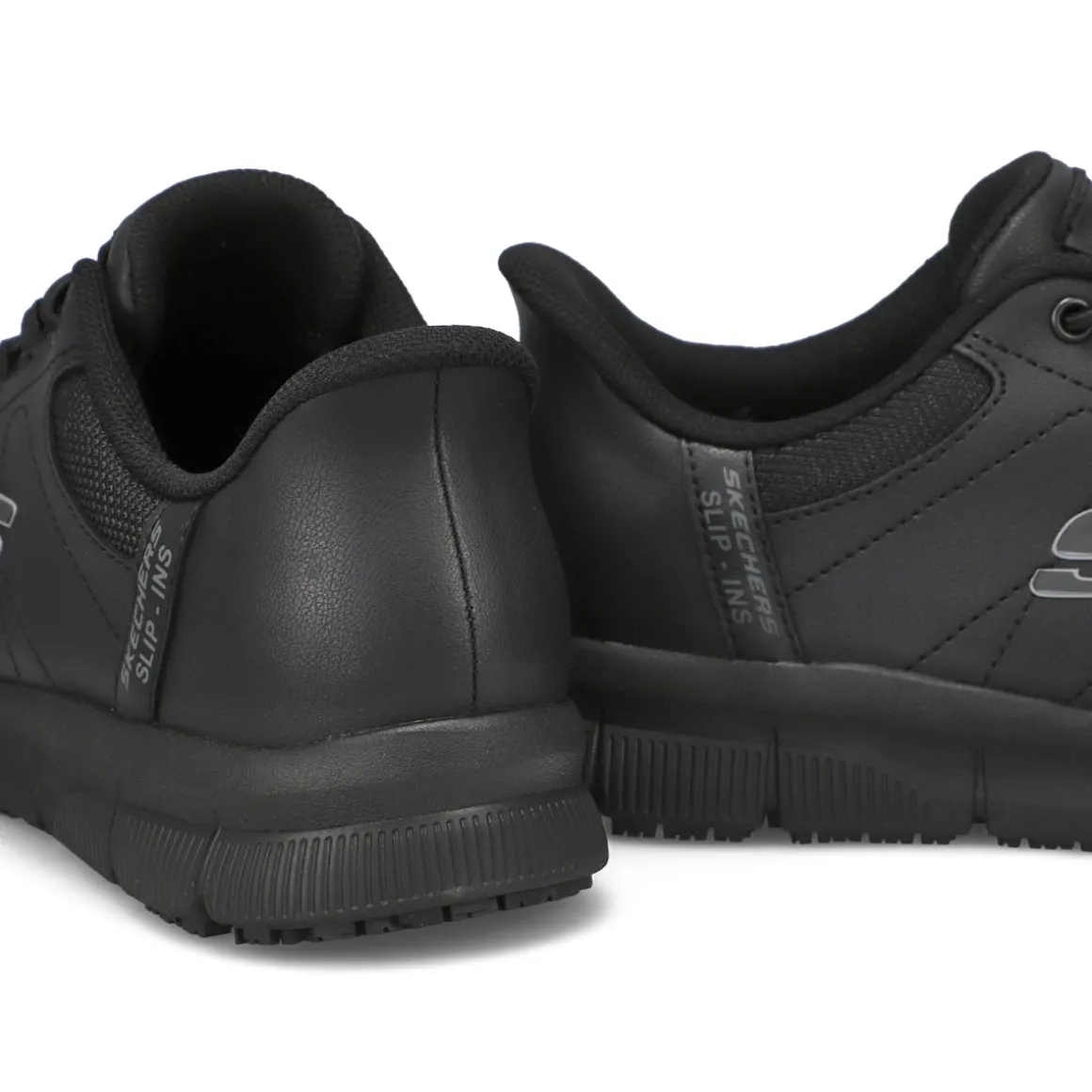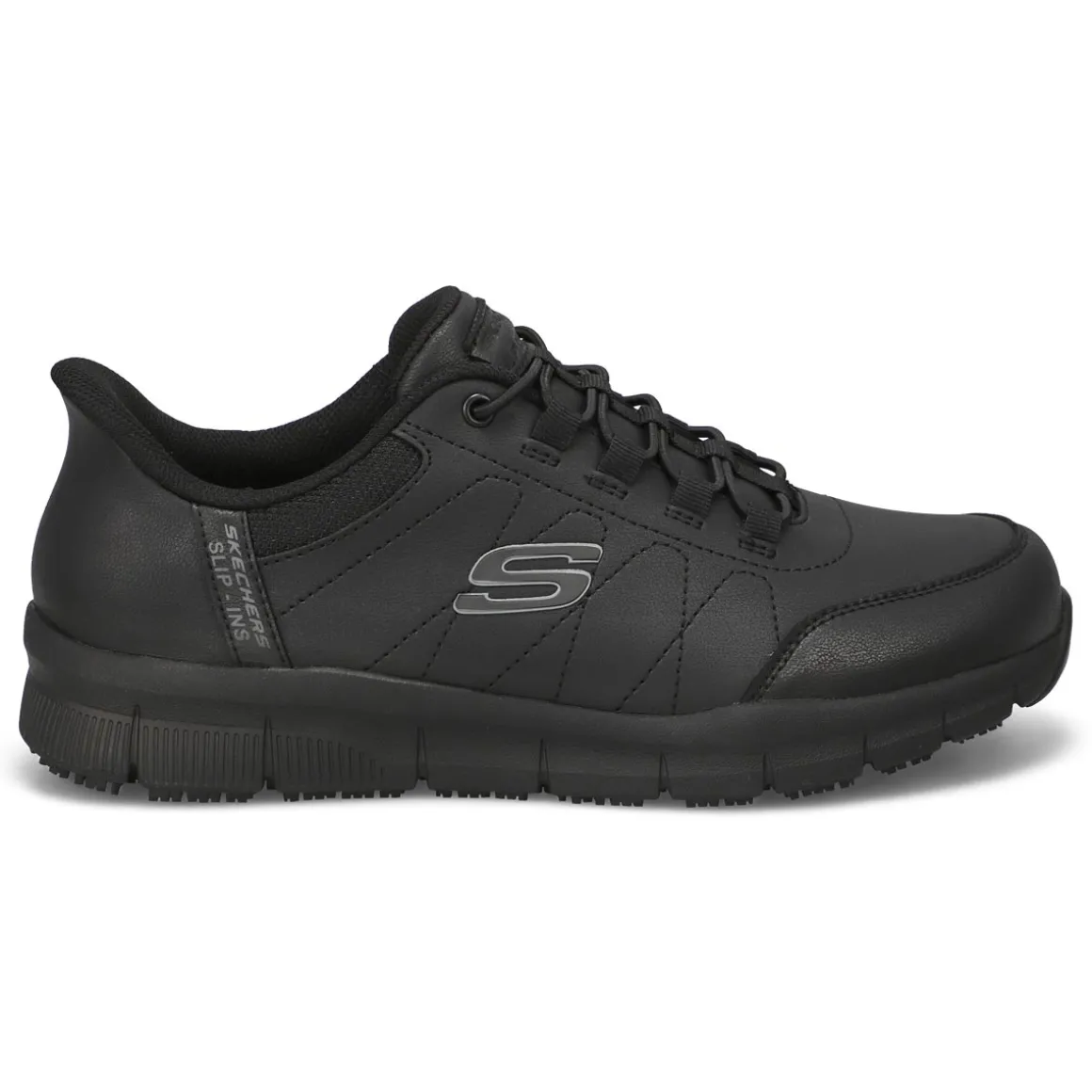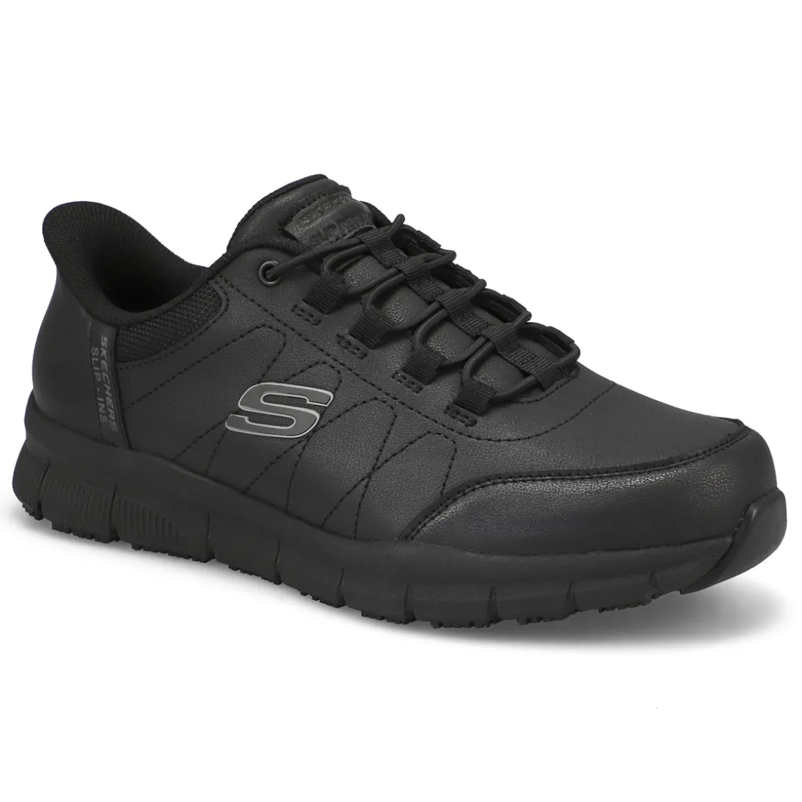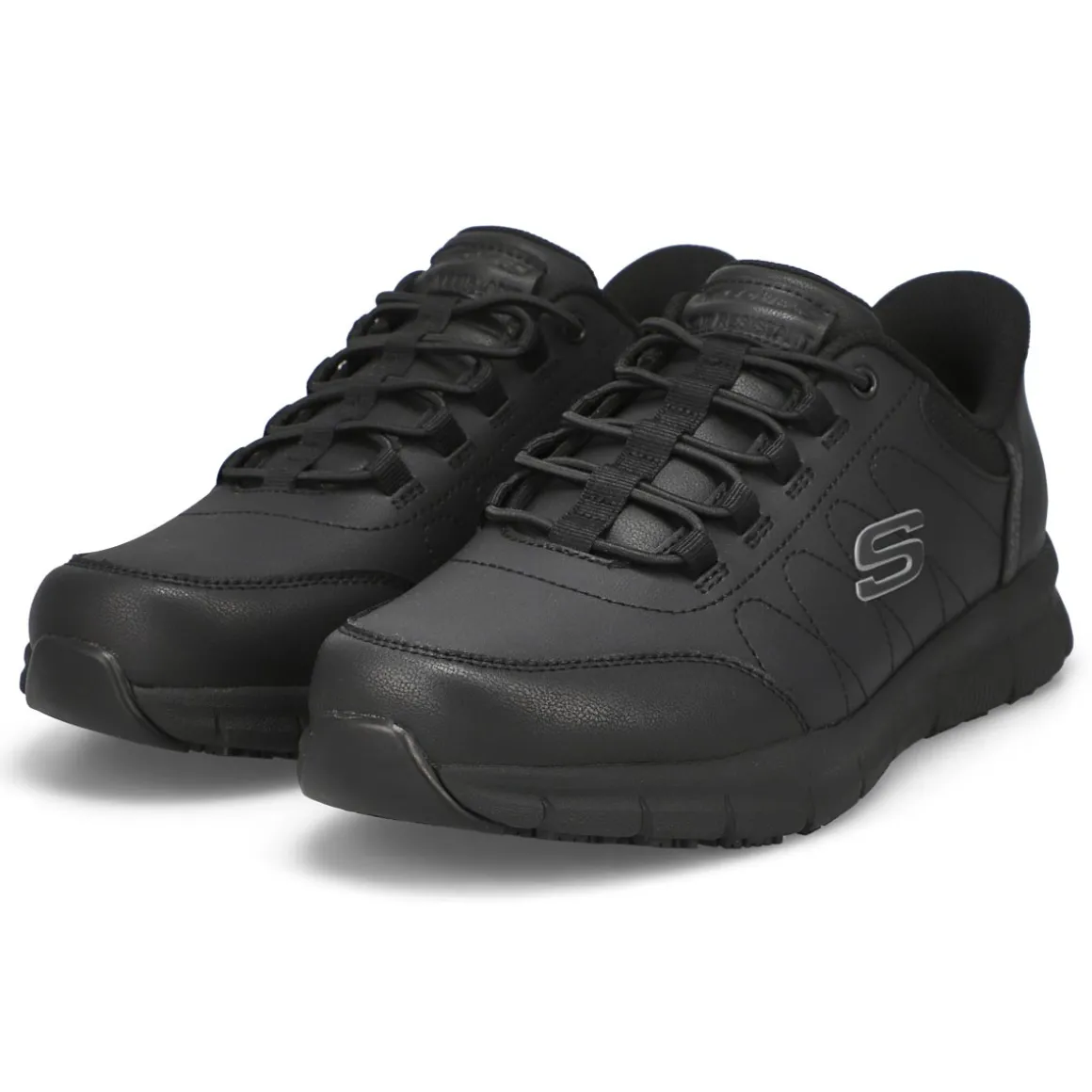 Surefooted comfort and easy-wearing safety combine in Skechers Hands Free Slip-ins Work: Nampa – Knotly black sneakers. This slip-resistant design features a smooth leather and synthetic upper with stitching detail, stretch laces, and a cushioned Skechers Memory Foam insole. Exclusive Heel Pillow holds your foot securely in placeShock-absorbing flexible lightweight midsole. Electrical Hazard (EH) safe design tested ASTM-F2892. Wide Width.