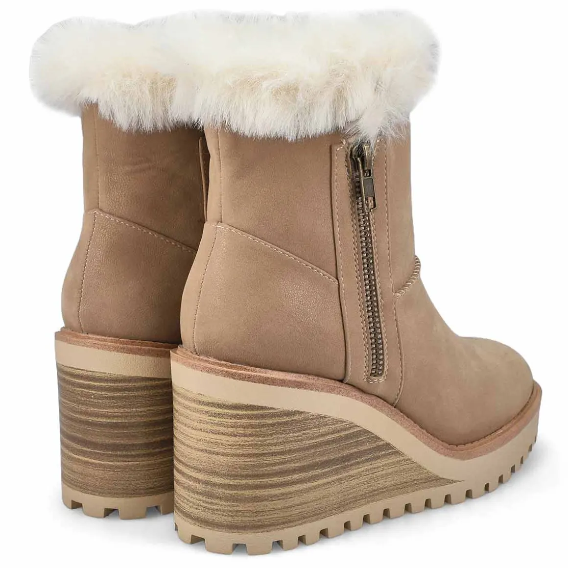 The Natalie Wedge Fur Trim synthetic leather casual bootie from SoftMoc is the perfect boot choice for your outfit that is demanding a cute and cozy look. Featuring a synthetic leather upper. A cushioned footbed to help create all day comfort. The Natalie boot is designed with a durable rubber outsole.