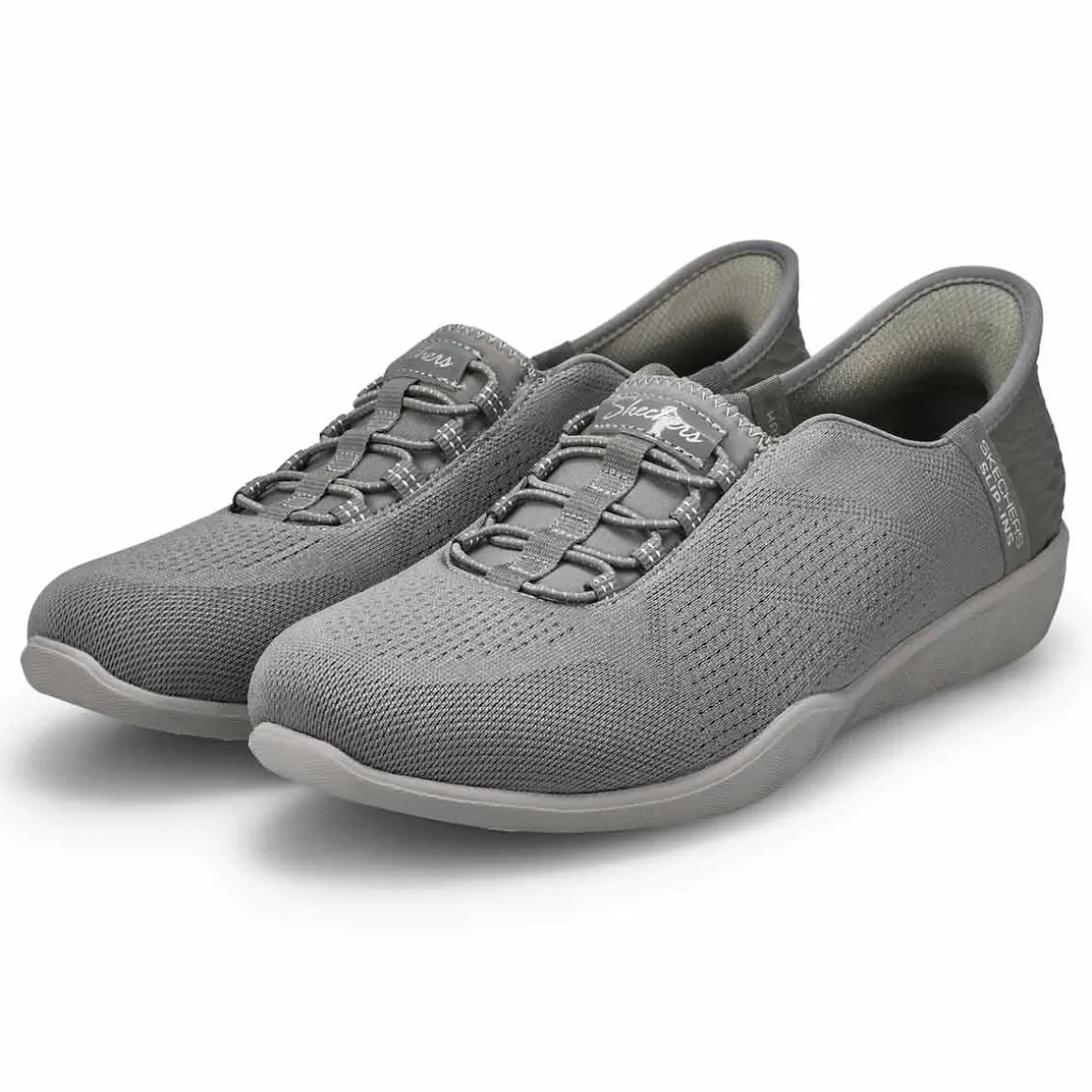 Step into effortless comfort with the Hands Free Slip-ins: Newbury St grey sneakers from Skechers. Featuring a Stretch Fit engineered knit upper with a stretch laced front and a cushioned Skechers Air-Cooled Memory Foam comfort insole. Stretch Fit design for sock-like comfort. Exclusive Heel Pillow holds your foot securely in place.