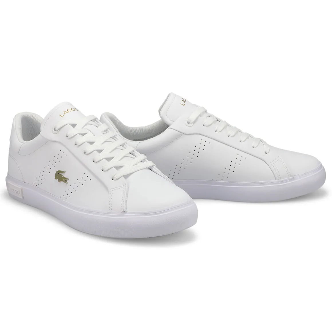 The women’s Powercourt 2.0 in white / gold by Lacoste is a timeless vulcanised sneaker with sleek leather uppers, colour pops and iconic branding. Step into the present, with these court-inspired silhouette sneakers with perforation detailing, leather and synthetic uppers, textile lining. The rubber outsole on these shoes will ensure all day comfort.
