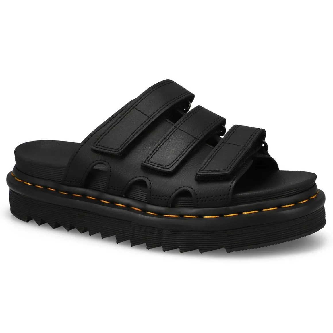 Slide into summer. The Raine black slide sandal from Dr.Martens combines a slider easy on/off convenience with Dr. Martens’ lightweight EVA Zebrilus sole and a comfortable SoftWair footbed. The upper has 3 adjustable Ripstop straps to help you find the perfect fit. The sole is marked with grooving and secured with Dr. Martens’ yellow welt stitching.