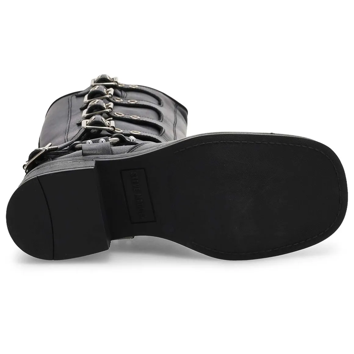 The Rockyy brown Knee High Boot from Steve Madden features the wide profile of an engineer boot with harness and buckle hardware adding an industrial edge and giving the design an adjustable fit. Top gore with 4 adjustable buckle straps. Block heel engineer boot design. Leather upper with breathable textile lining.