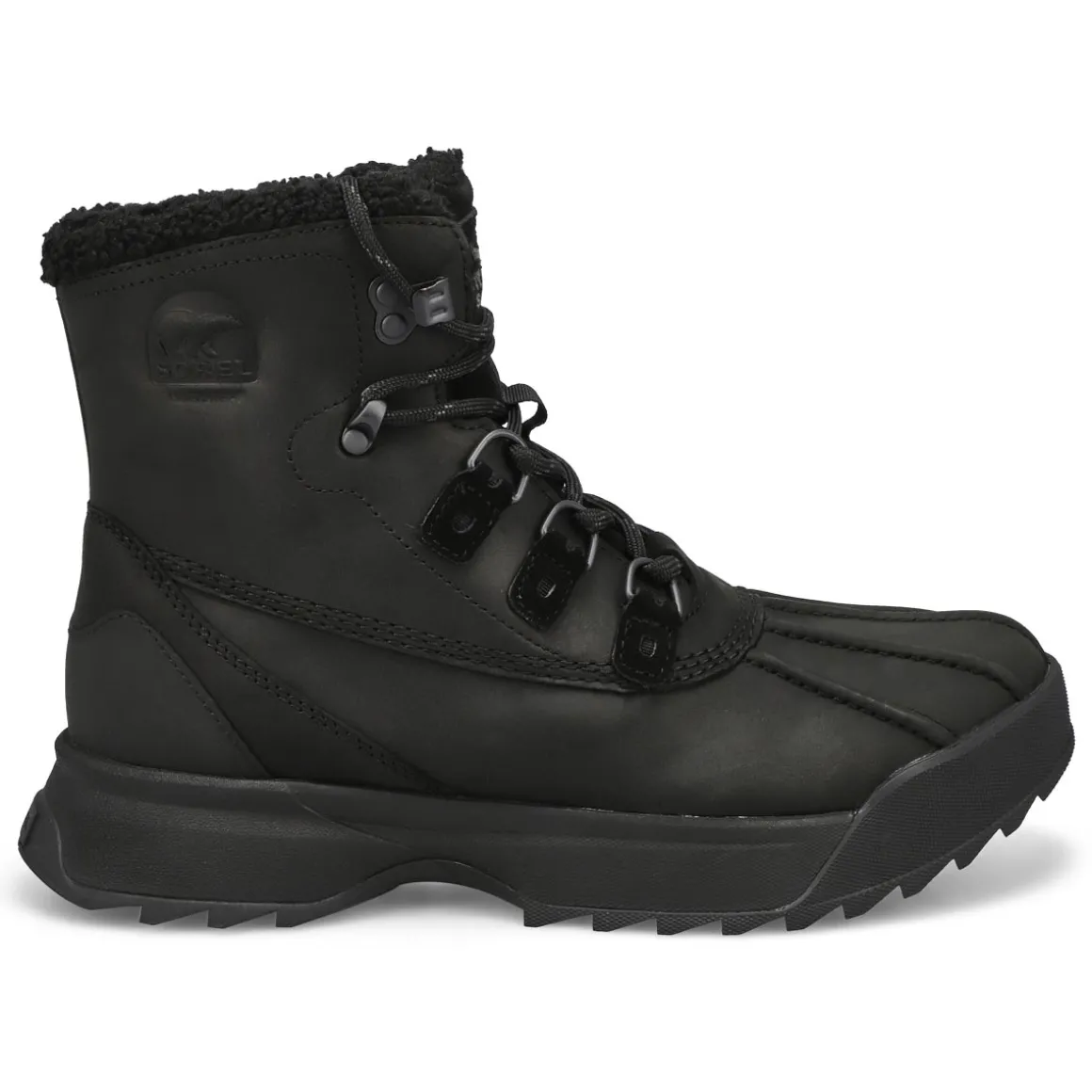 Stay cozy with the Scout 87′ Lux black/ black waterproof boot from Sorel. Featuring a leather upper with a suede tongue and metal D-ring laces for quick adjustments. Faux shearling collar lining and fleece internal lining. Removable molded EVA footbed with fleece topcover. Lightweight molded Livelyfoam midsole. the Scout 87 Lux is designed with an Evertread rubber outsole. Please note: Laces and zippers incorporated in SOREL footwear are not waterproof.