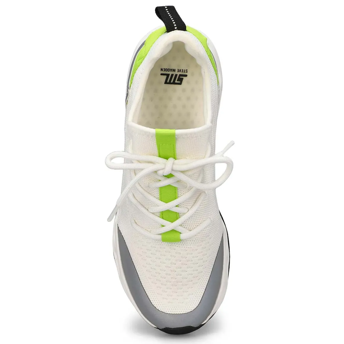 Get ready to introduce the hottest sneaker of the season into your style. Meet the Shani white/ silver lace up sneaker from Steve Madden. Featuring a knit upper material with a cushioned footbed. Breathable textile lining. Durable rubber outsole. This all day style can handle your busiest schedules in style.