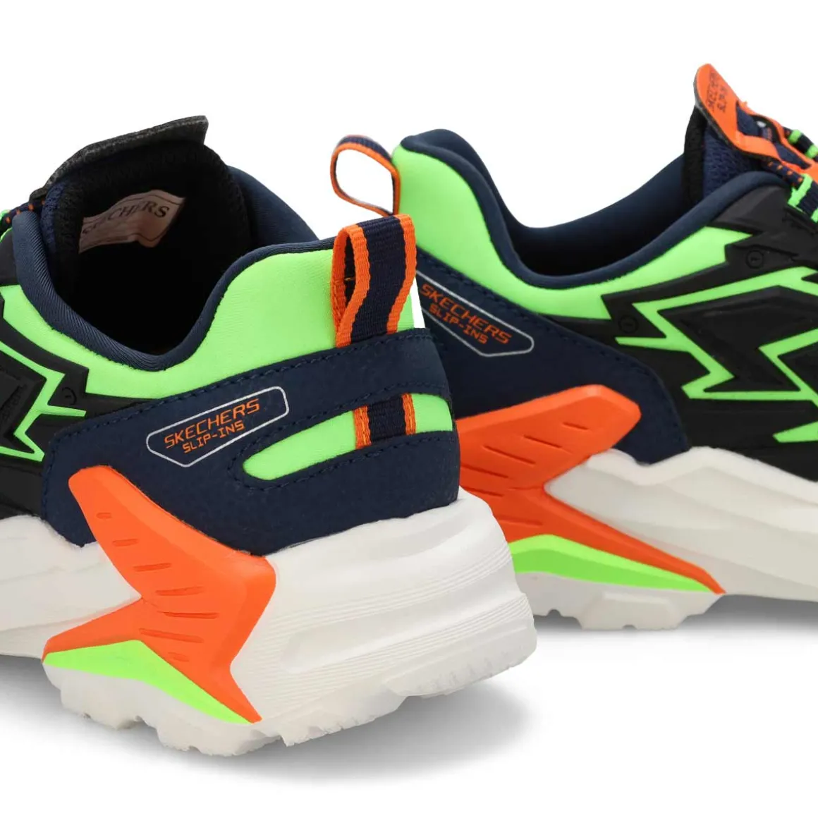 Feel the power of striking style and cloud-like comfort in the Hands Free Slip-ins: Skech-Bots 2.0 black/ lime green sneaker from Skechers. Designed with Skechers’ exclusive Heel Pillow that helps hold your foot securely in place , this sculpted thematic style features a synthetic and mesh upper with a stretch-lace front panel and a cushioned Skechers Air-Cooled Memory Foam insole.