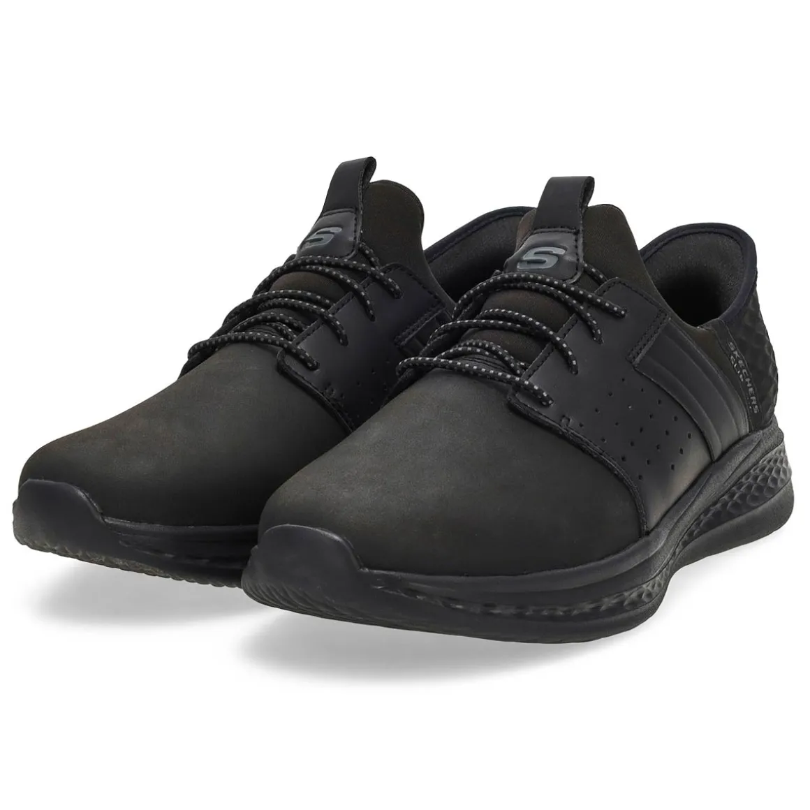 Sleek athletic style arrives with signature comfort in the Slip-ins Relaxed Fit: Slade Zachary black casual from Skechers. Designed with Skechers’ Exclusive Heel Pillow, this stretch-laced style features a leather and synthetic upper with a charcoal-infused Skechers Air-Cooled Memory Foam insole and Skechers Goga Mat Arch cushioning. Charcoal infused insole helps neutralize potential odor. Wide Width