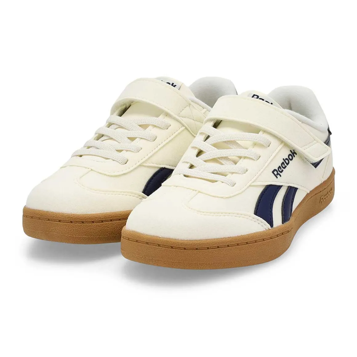 The Smash Edge Digital Gleam/ White/ Gum lace up sneaker from Reebok brings heritage football style to their playground look. Take them on and off quickly and easily with stretchy laces and a strap. A rubber outsole finishes things off perfectly. Cushioned and stylish, these sneakers make a great addition to their footwear collection.
