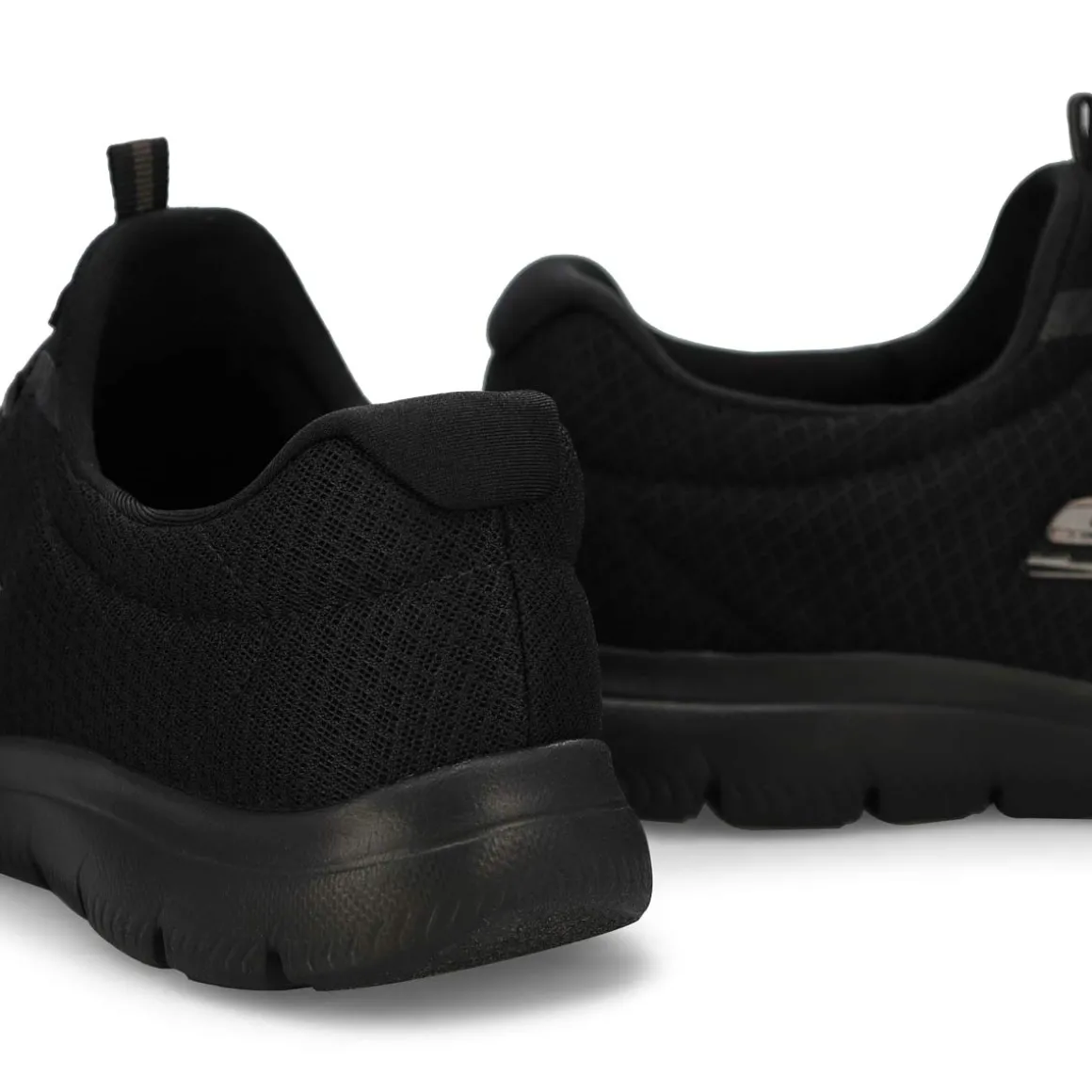 Get right to the sporty style and comfort wearing the Summits black slip on from Skechers. Features a Jersey knit mesh nearly one piece upper in a nearly seamless upper design. Slip on bungee front athletic training sneaker design. Soft fabric shoe lining with a Memory Foam full length cushioned comfort insole for all day comfort. Wide Width.