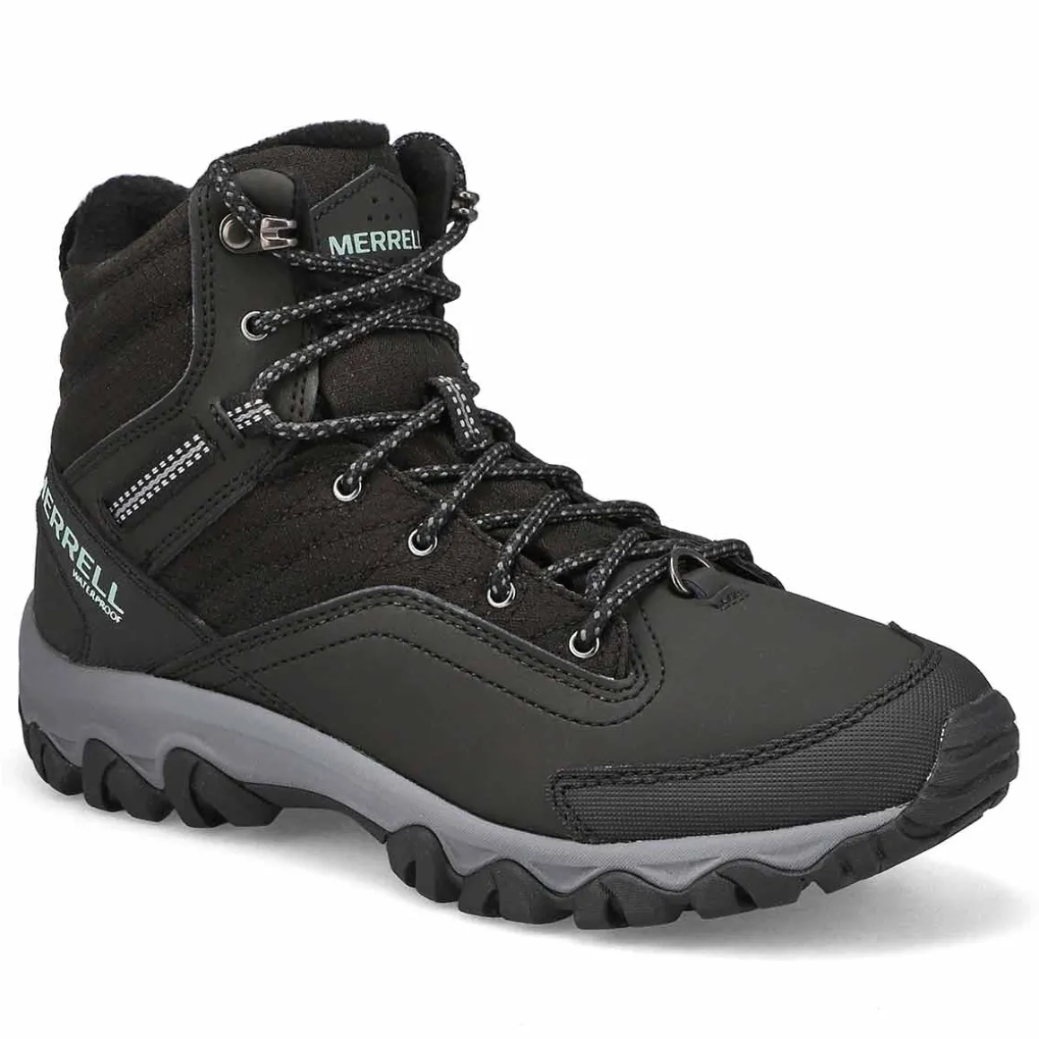 With waterproof coated leather, a waterproof membrane, and 200g of warm insulation, you can depend on the Themo Akita Mid Waterproof black winter boot from Merrell. This cold-weather boot helps protect against the elements this season. Featuring a bellows tongue to hellp keep out debris. Kinetic Fit BASE removable contoured insole for flexible support.