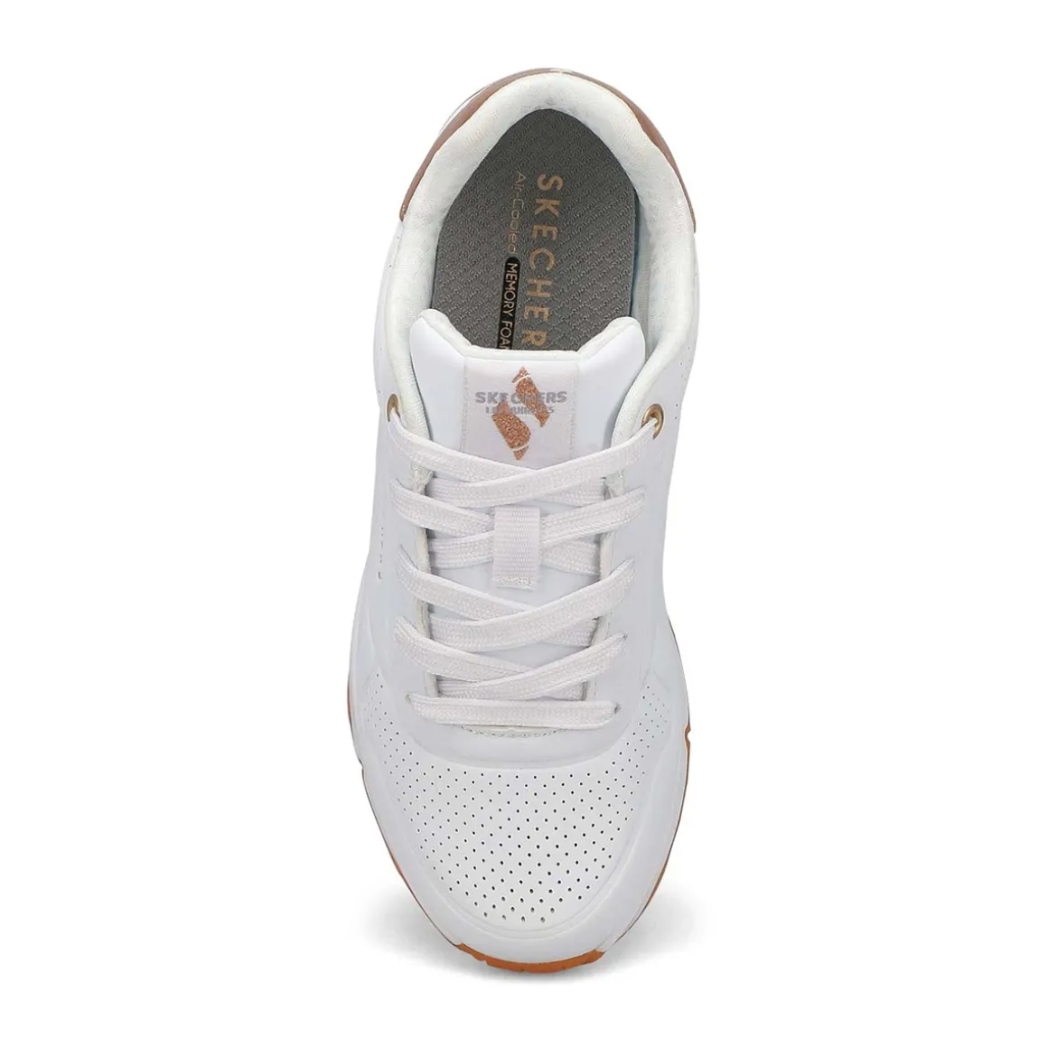 Your little one will turn heads with a bright statement wearing the Uno Gen 1 black lace up sneaker from Skechers. This fashion style comes in lace up styling for a secure fit, the perfect complement to summer wardrobes. Featuring a smooth perforated synthetic upper with an Air-Cooled Memory Foam insole, and a visible Skech-Air air-cushioned midsole.