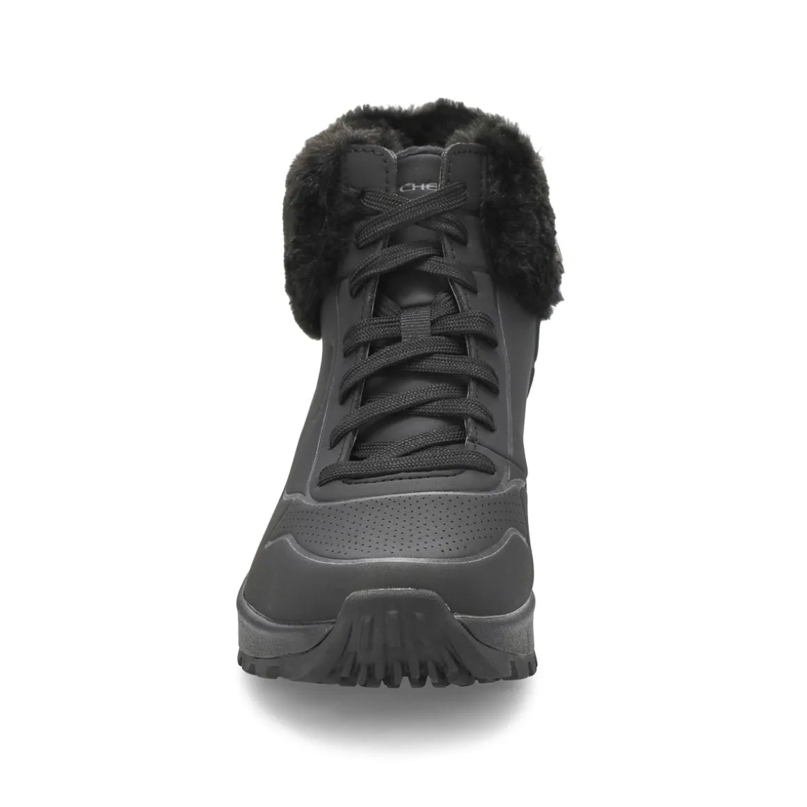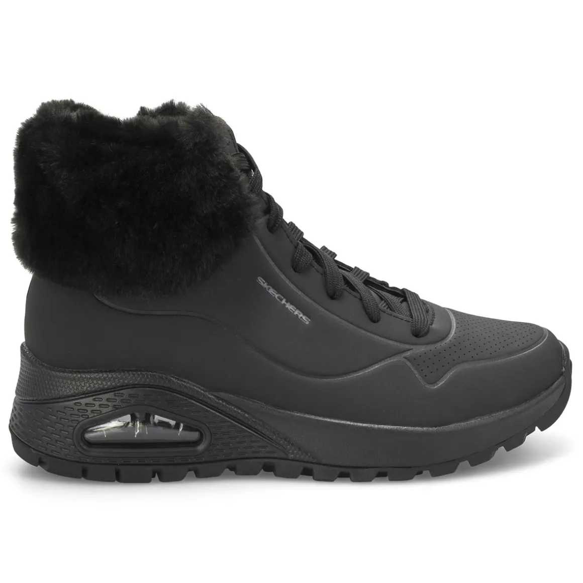 Step into stylish hiker vibes with the Street Uno Rugged Fall Air black / black sneaker from Skechers. This lace up fashion sneaker boot features a perforated synthetic upper with faux-fur trim, a Skechers Air-Cooled Memory Foam and a Skech-Air visible airbag midsole. Flexible rubber traction outsole. Skechers logo detail.