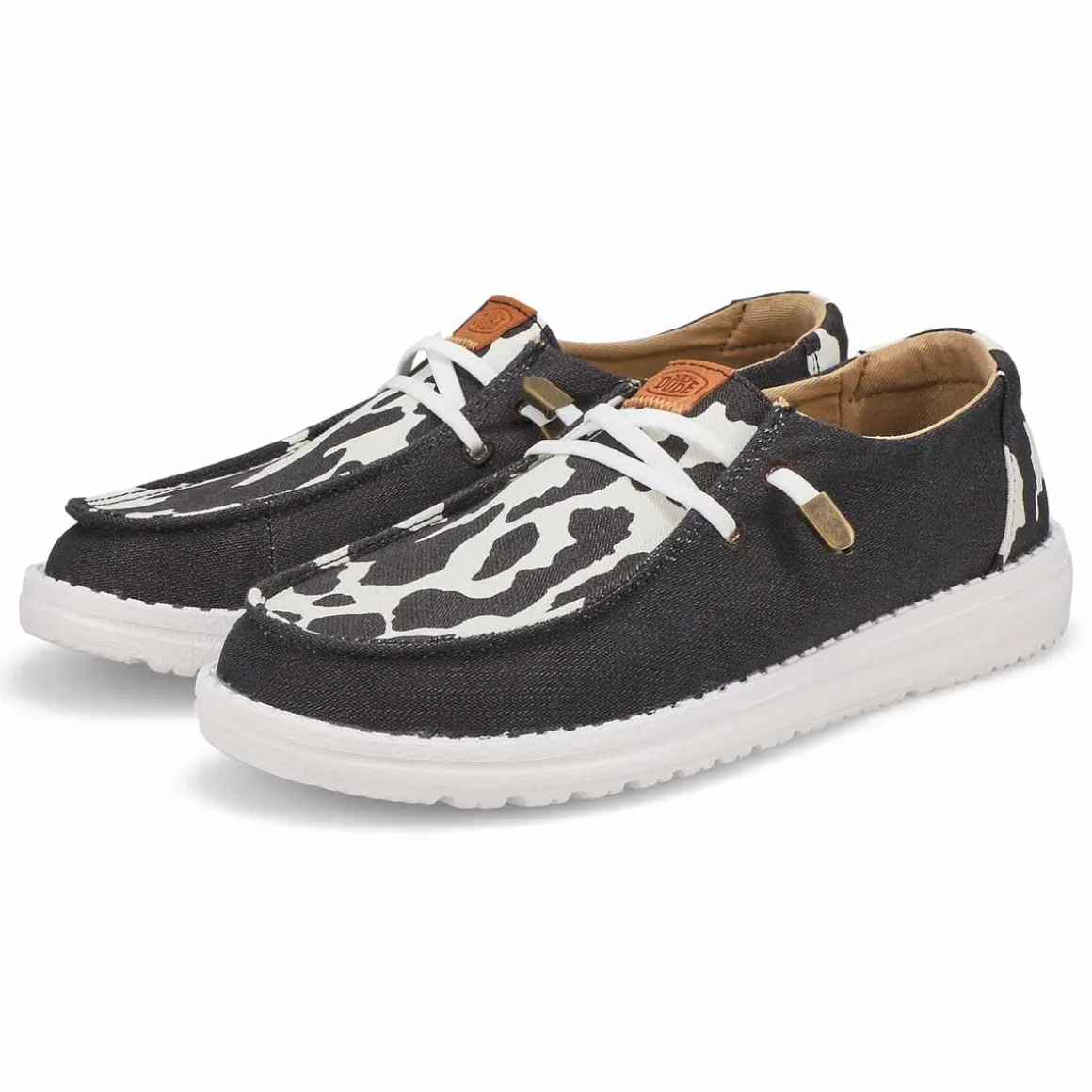 Complete with a comfy flexible outsole, eye-catching elastic laces with metallic pop on the end, the Wendy Animal black/ cow shoe from HEYDUDE takes you from office to adventure. The Wendy Animal casual shoe is designed with an ultra-light, flexible outsole The Wendy Animal shoe is a ow-top, chukka construction that is travel ready.