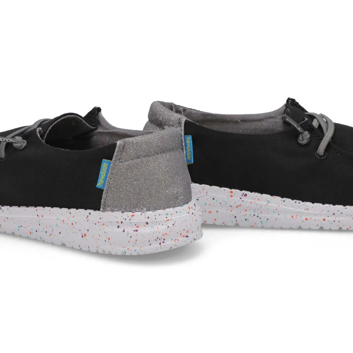 HEYDUDE’s iconic low-top moc with a custom look. Plus a little extra height and a little extra cushion. The Wendy Youth Casual disco black shoe from HEYDUDE is still super lightweight. Easy-On system and their patented UltraLIGHT EVA outsole for superior comfort. Featuring contrasting textures and hand-stitching at the heel.
