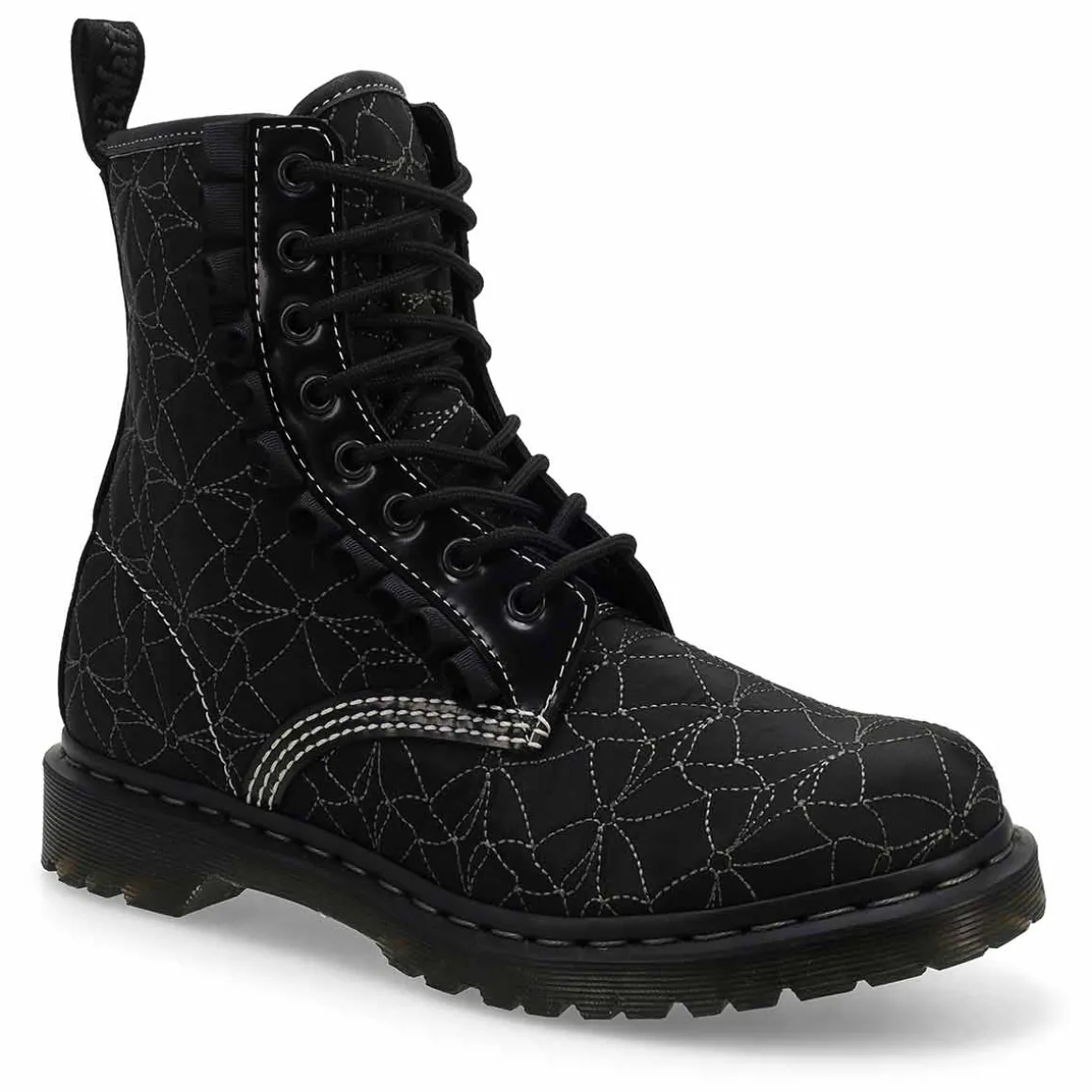 A decorative takeover on a classic. The 1460 Frill 8-eye boot sees the original Dr. Martens’ silhouette embellished with bows and frills. Crafted in Buttero, a soft leather with a satin gloss and supple feel. They stitched intricate bows and contour lines across the upper in contrasting white while weaving black frills behind the eyelets and laces.
