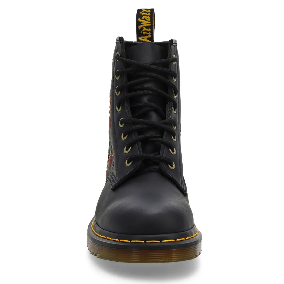 The 1460 Vonda 8-eye black boot from DR. Martens was the first Dr. Martens boot — and this one is true to the original, but borrows style from the 14-eye 1914 Vonda. Embroidered flowers cascade down the side of the boot, designed especially by Dr. Martens’ in-house creatives. Featuring a soft leather upper with a durable DMC outsole.