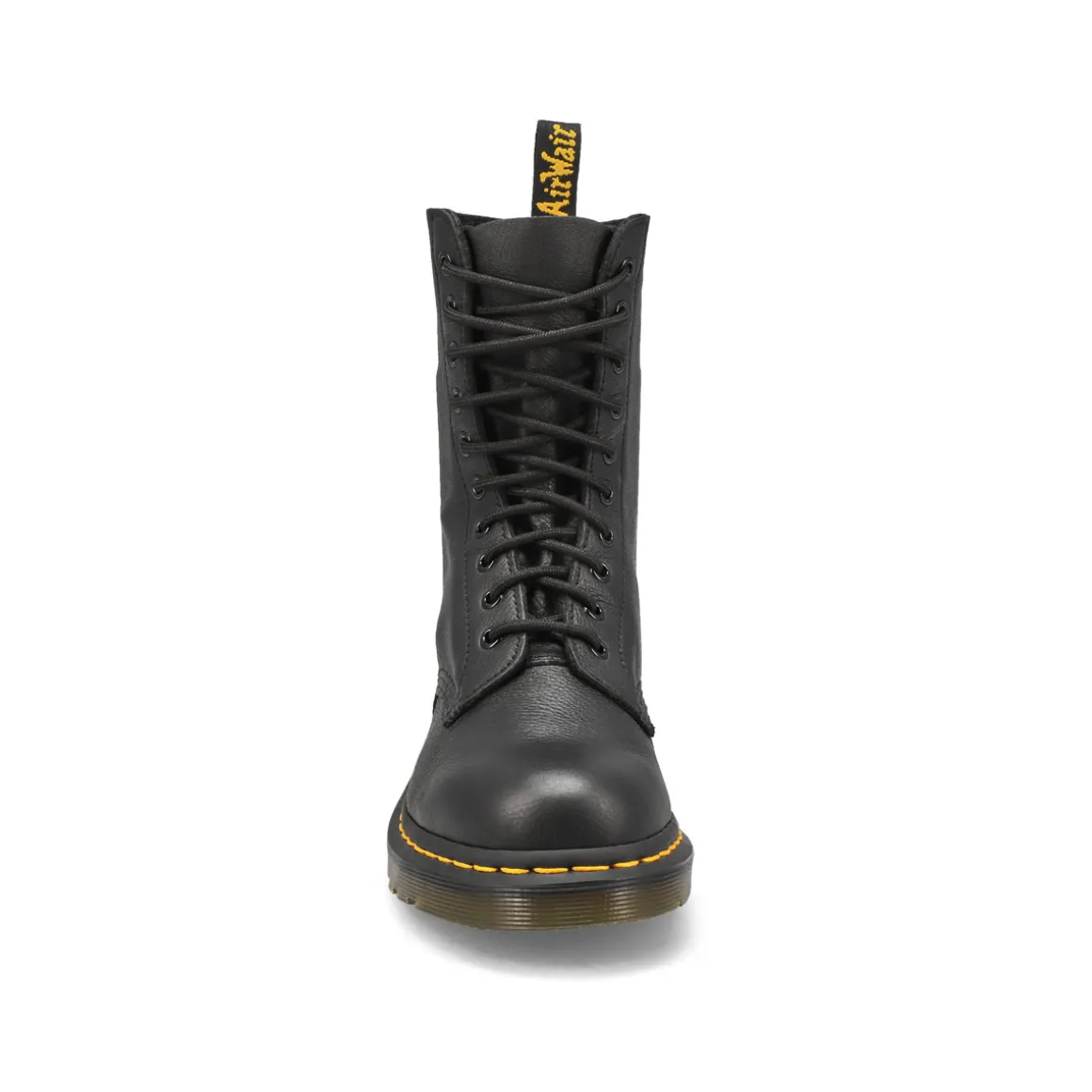 The 1490 10-eye black casual boot from Dr. Martens retains all the history and tough-girl durability of the original, iconic 10-eye — and all the DNA, like a scripted heel-loop, visible stitching and grooved edges on an air-cushioned oil and fat resistant sole. Genuine leather upper made on a Goodyear Welt Construction – the upper and sole are heat-sealed & sewn together.
