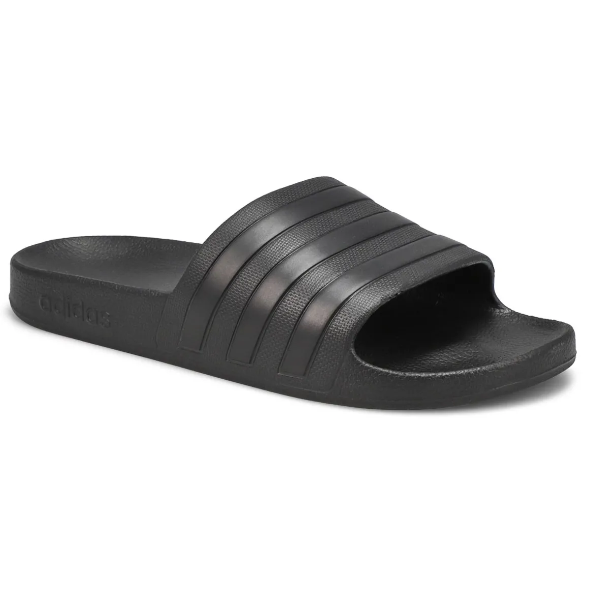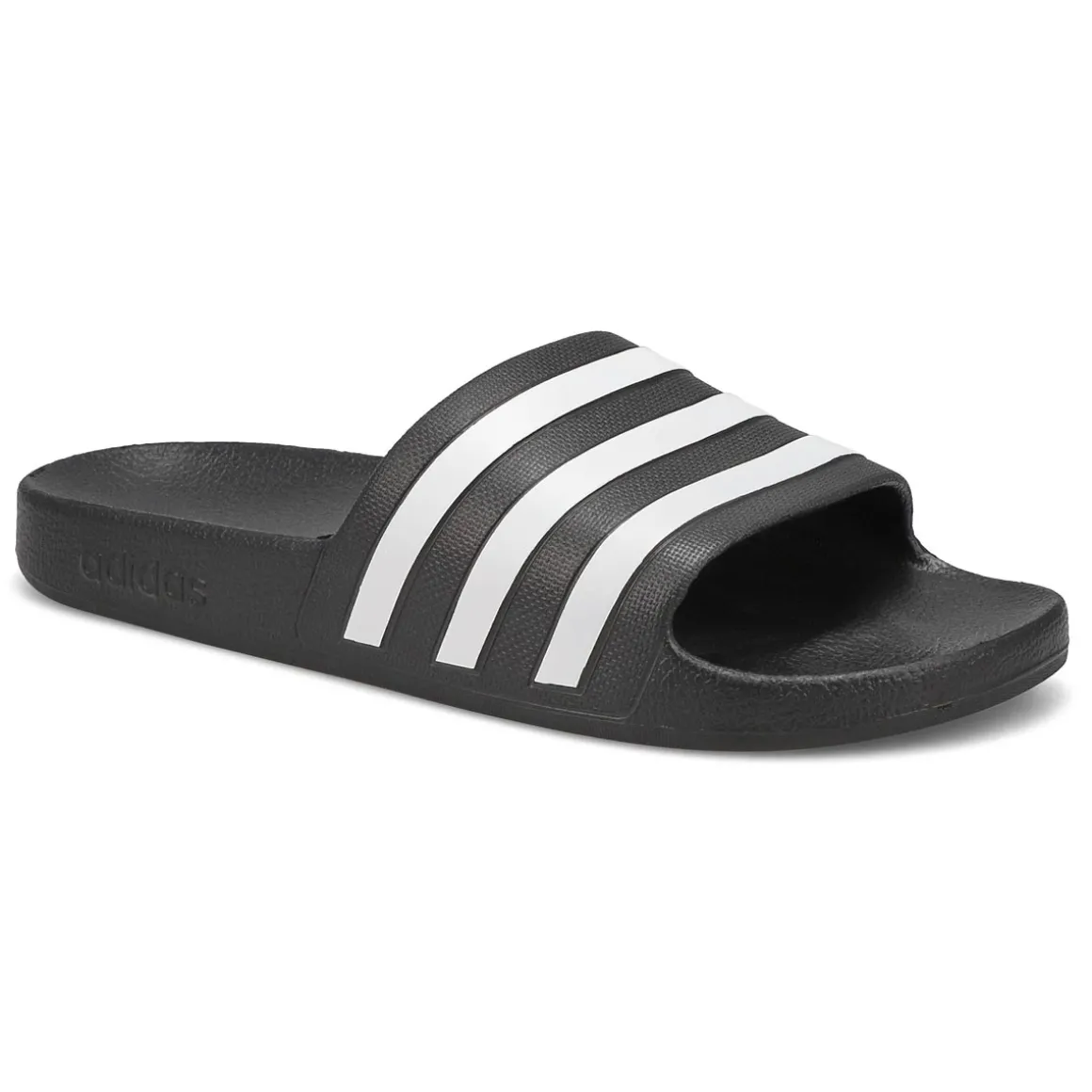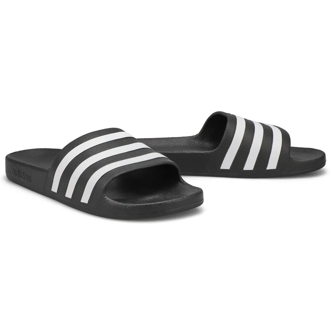 Quick drying Slides with 3-Stripe Style! An iconic style for slick surfaces. These Adilette Aqua slide sandals by Adidas are quick-drying slides flash 3-Stripes across the bandage-style upper. Plush cushioning in the footbed provides the ultimate in comfort in and out of the shower.
