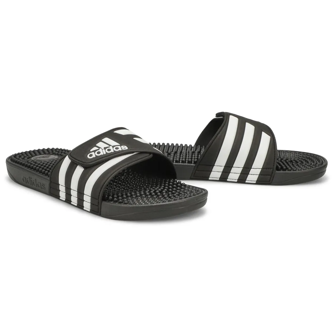 Like a spa for your feet, the Adissage black/ white slide sandal from Adidas have massage nubs on the footbed that soothe and relax tired muscles. The adjustable bandage upper dries quickly and features 3-Stripes and an adidas Badge of Sport. An EVA outsole offers lightweight comfort. You will want to add Adissage to your must-have list for your wardrobe this season!
