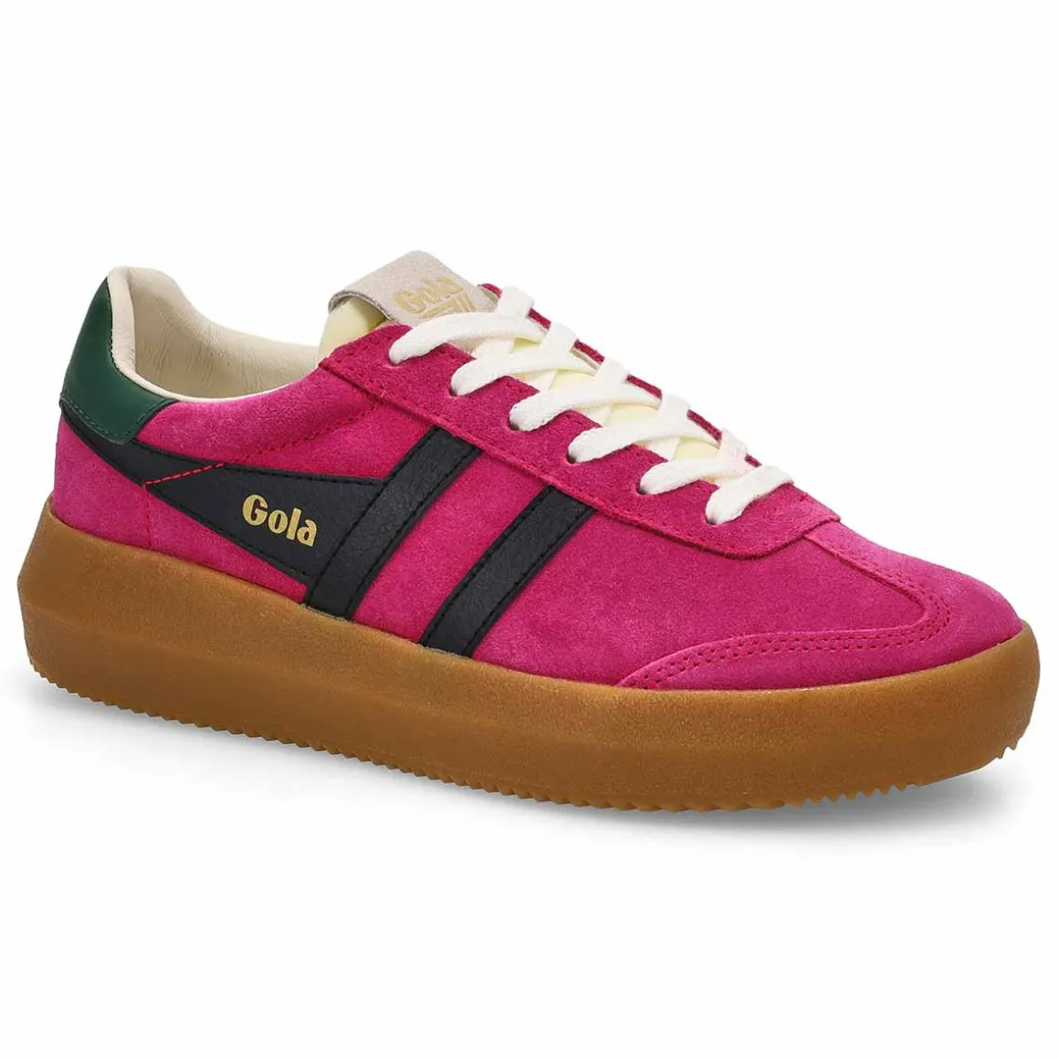 The Athena fuchia /black lace up sneaker from Gola combines a sleek T-toe upper. Crafted from luxurious suede, these fashion trainers feature textile and leather linings for a soft and breathable feel. With its elevated sole, Gola Athena is both a versatile and super stylish women’s footwear choice; dress up or down.