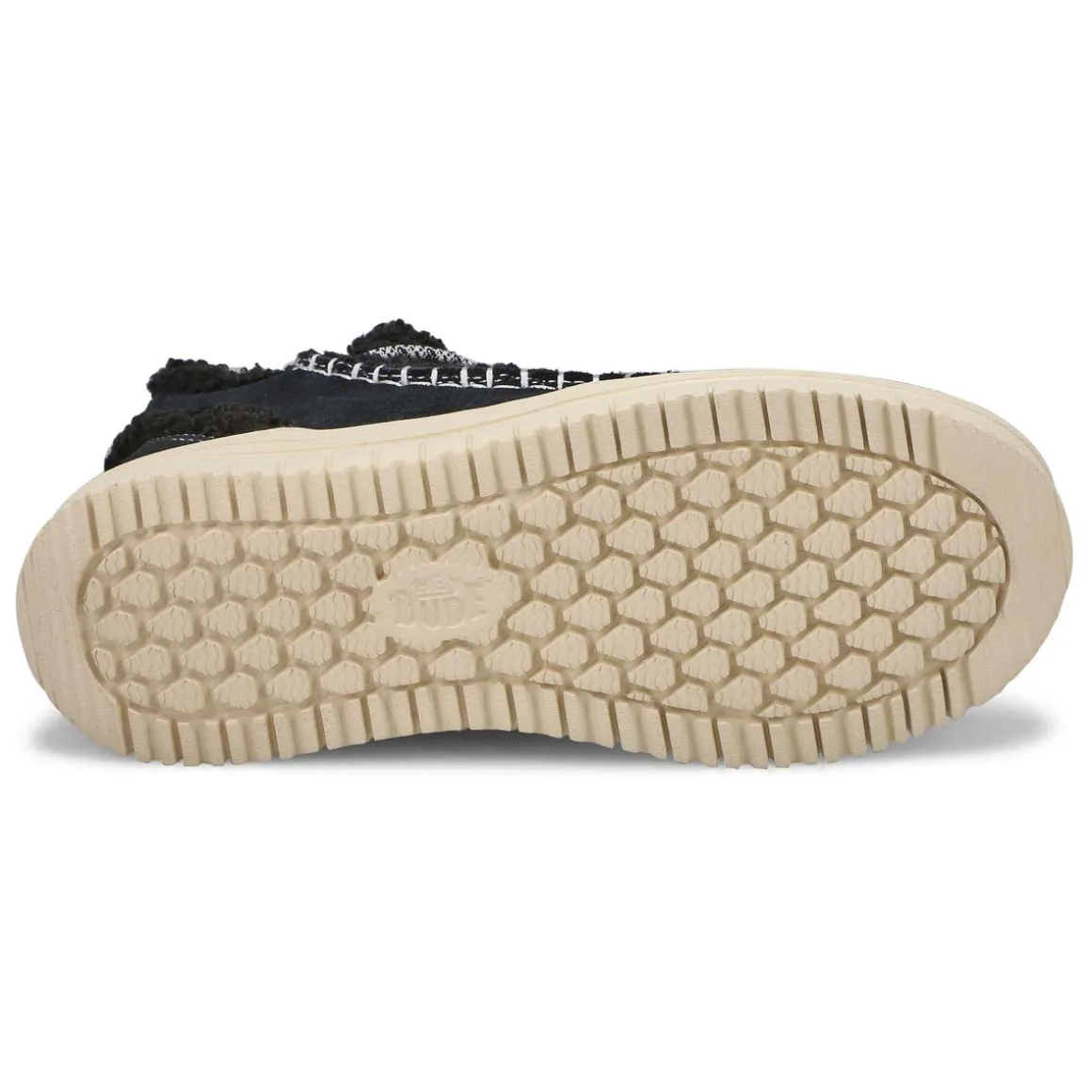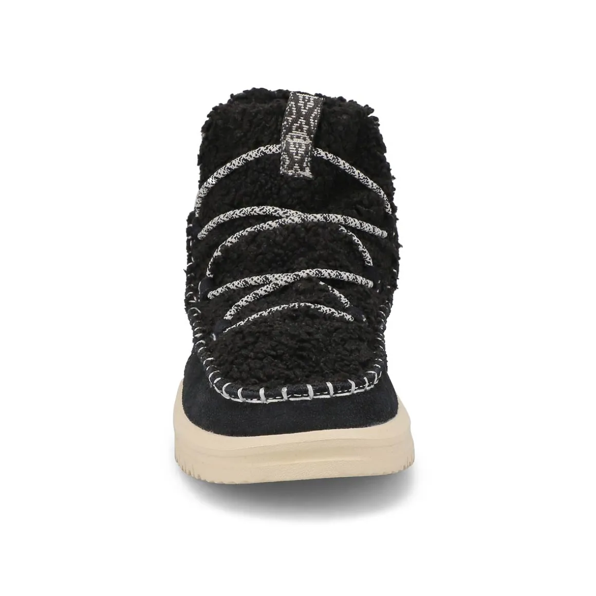 Camden just got cozier with the Camden Suede Cozy black slip on ankle boot from HEYDUDE. Covetable 360 degree comfort, suede upper with a faux shearling vamp and oh-so-light flex outsole will have you walking on cloud nine. Easy on heel webbing loop with stretch lacing. We were thinking comfort and extra cute–totally delivered.