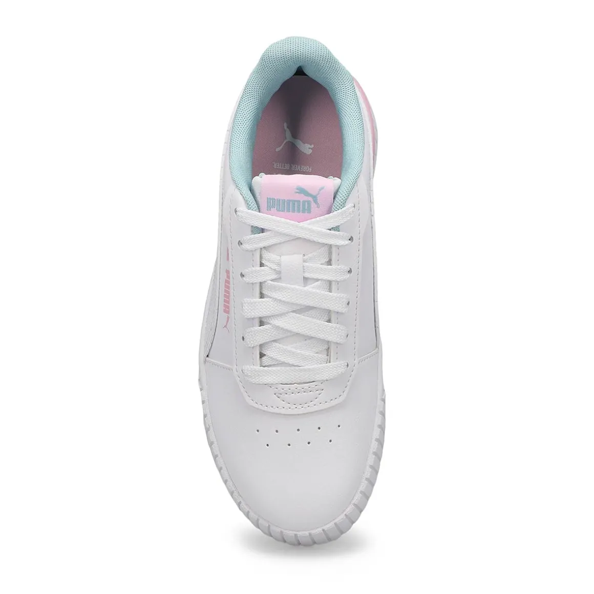 The Carina 2.0 Jr sneakers by Puma are inspired by styles from the 80s, in a new tennis silhouette interpreted to fit today’s laid-back sneaker look of Californian beach towns. This new edition keeps the familiar look and feel but updates with meaningful and commercial refreshments such the new tooling design. Wider vertical lines as well as a Puma logo on the heel add a young, street look. The synthetic leather upper is accented by a perforated vamp and the well-known Puma Formstripe. The SoftFoam+ sockliner provides superior cushioning and optimal comfort for every step of your child’s day.