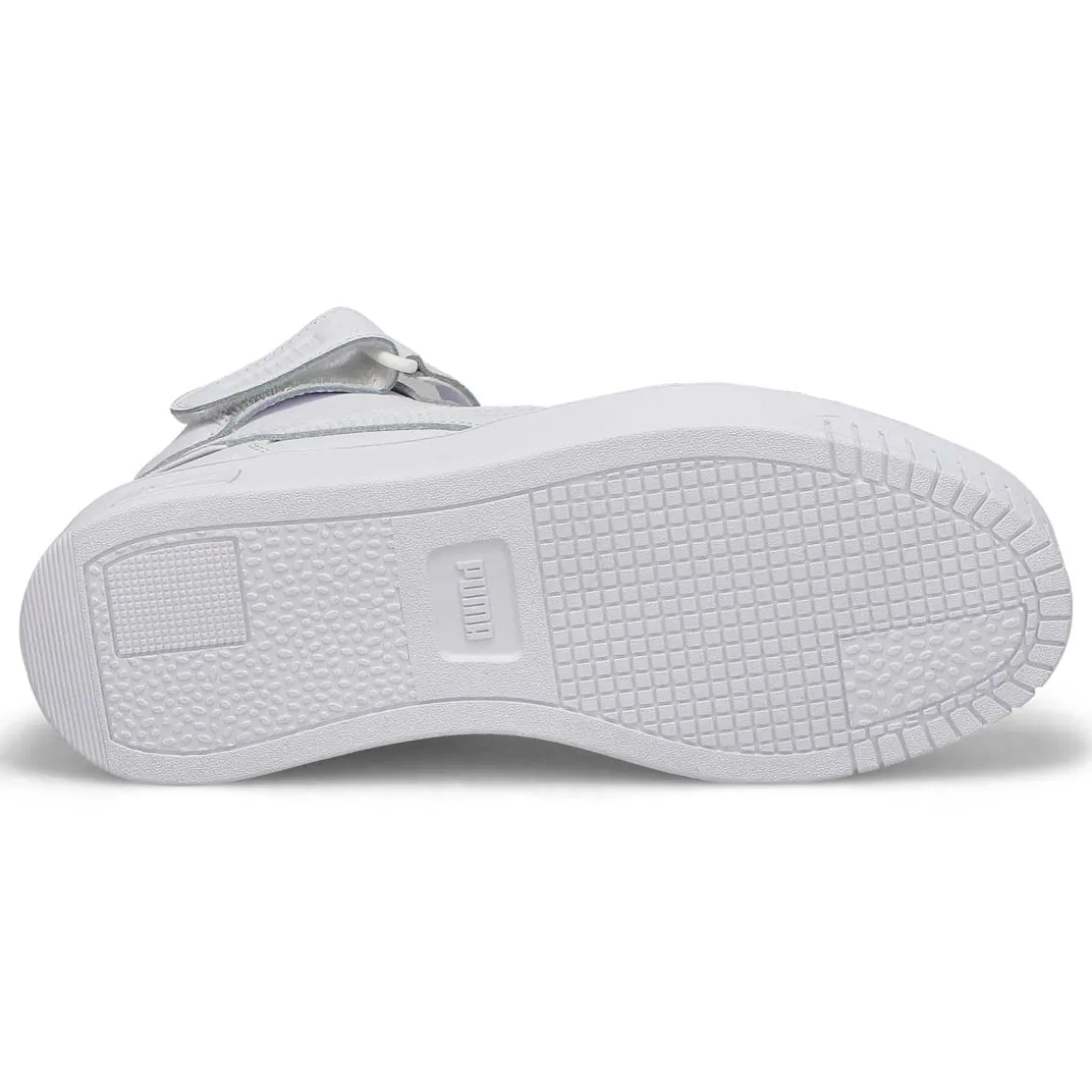 The Carina Street Mid white/ gold sneaker from Puma features a streetwear-inspired design and a slightly elevated platform, making them your perfect choice for casual, everyday outfits. Upper of this shoe is made with at least 20% recycled materials as a step toward a better future. SOFTFOAM+: Step-in comfort sockliner designed to provide soft cushioning thanks to its extra thick heel.