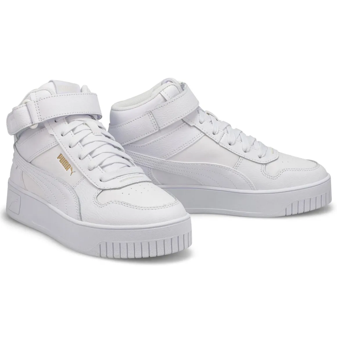 The Carina Street Mid white/ gold sneaker from Puma features a streetwear-inspired design and a slightly elevated platform, making them your perfect choice for casual, everyday outfits. Upper of this shoe is made with at least 20% recycled materials as a step toward a better future. SOFTFOAM+: Step-in comfort sockliner designed to provide soft cushioning thanks to its extra thick heel.