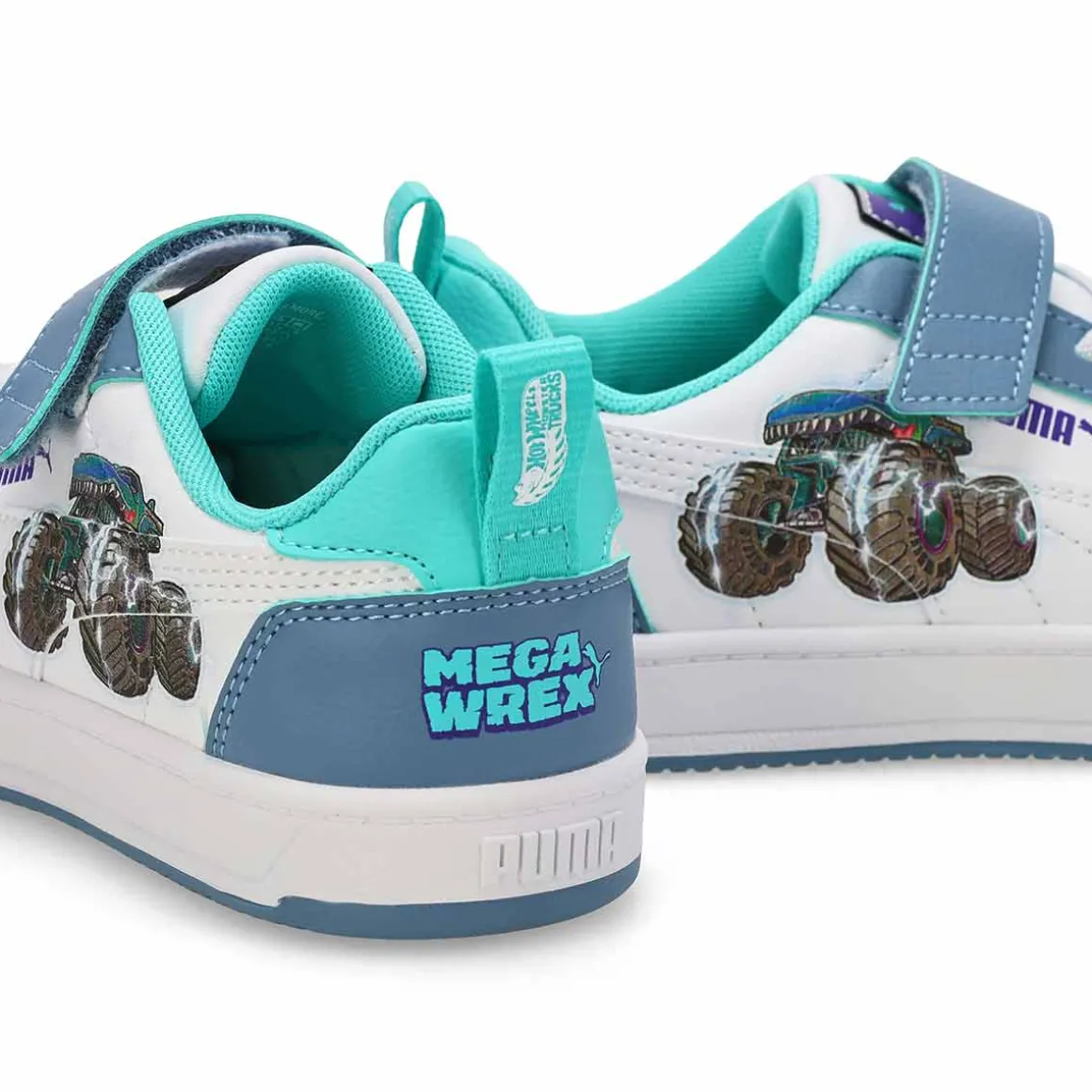 They will sport a bold style in the Caven 2.0 Hot Wheels cool blue/ white/ aquatic sneakers from Puma. Synthetic upper, round toe with breathable perforations, and padded tongue and collar to provide optimal comfort. Lace-up closure with blind eyelets offers an adjustable fit. Non-marking rubber outsole with tread pattern provides maximal stability.
