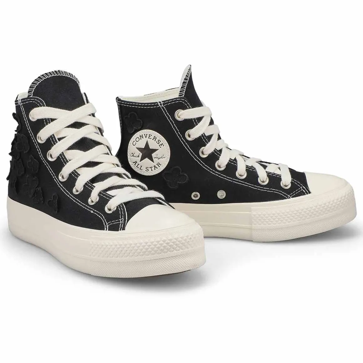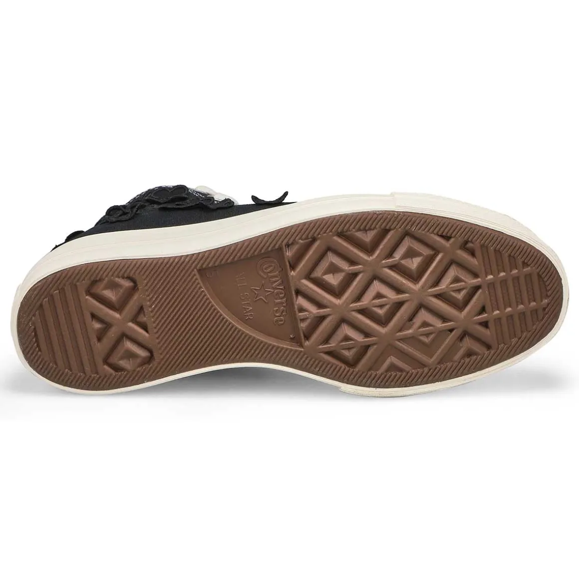 The Chuck Taylor All Star Lift Flower Play Hi Top Platform sneaker in black/black from Converse features a stacked platform sole ups the height, while iconic features stay true to the original. The Staple for everyone’s wardrobe. The Hi Top legend since ’57. The Chuck Taylor All Star Hi Top black sneaker keeps it classic. With the iconic elements we have all come to love like a cushioned insole and canvas upper keeping it comfortable. You got it with this iconic silhouette.