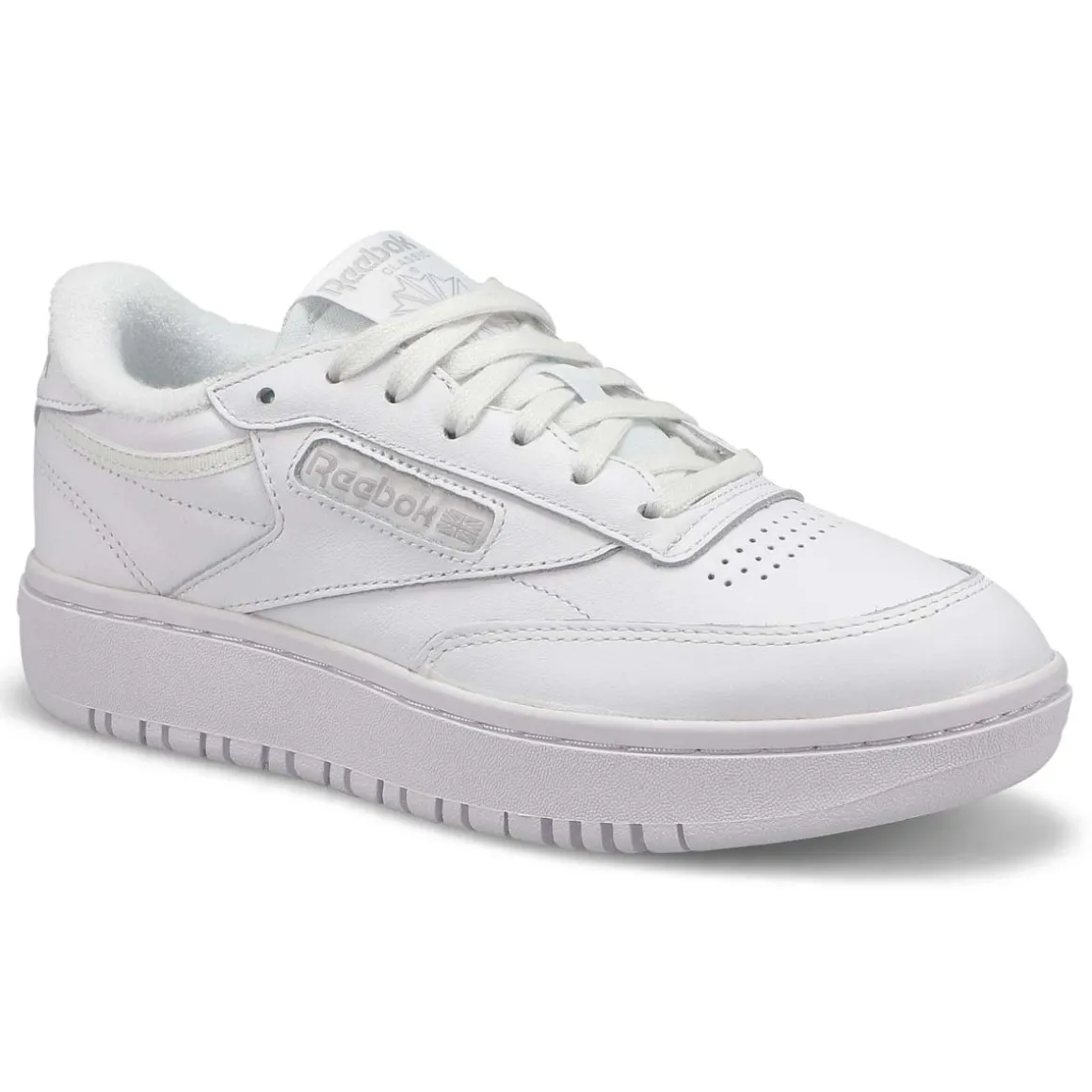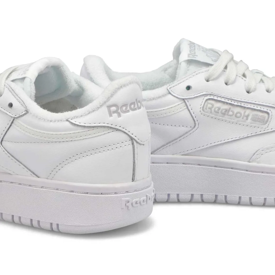 Clean, minimalist design. The Club C Double Chalk/Alabaster tennis-inspired shoes from Reebok keeps your look sleek and simple. Pops of subtle contrast color adds a chic touch. A Reebok logo window with a Union Jack gives them old-school style. The upper is made of soft, flexible leather. Stacked midsole for extra height and a chunky profile. There’s nothing quite like a fresh white sneaker!