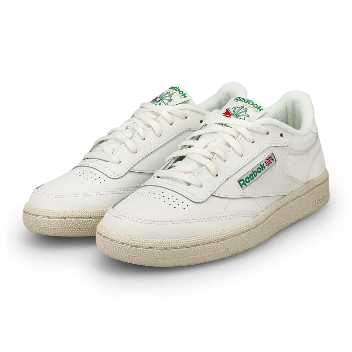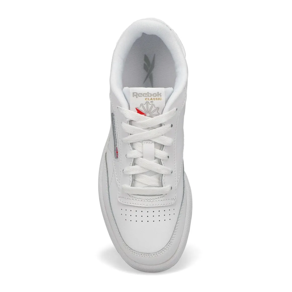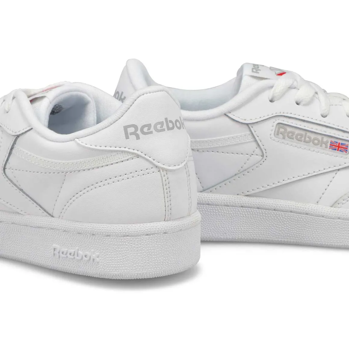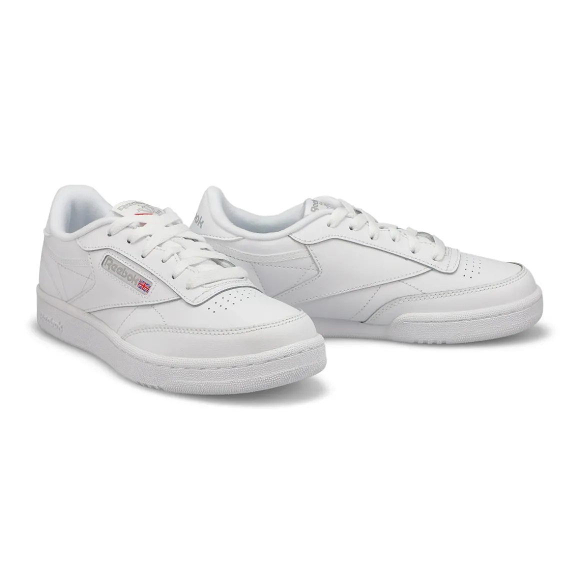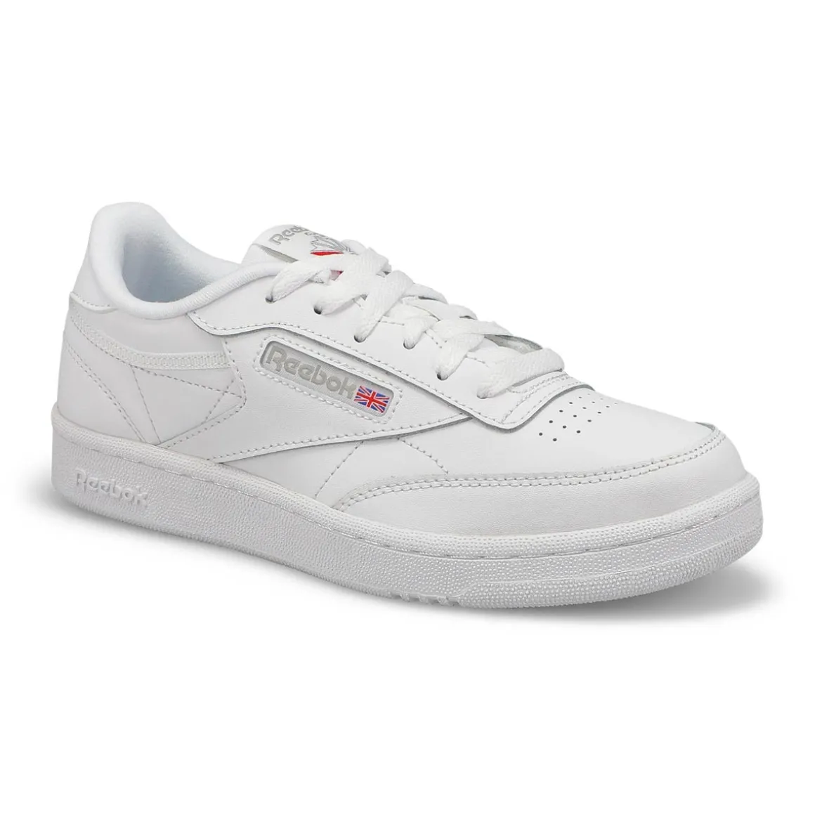 Clean, minimalist design. The Club C white tennis-inspired shoes from Reebok keeps your look sleek and simple. A Reebok logo window with a Union Jack gives them old-school style. The upper is made of soft, flexible leather. High-abrasion-resistant rubber outsole adds durable responsiveness. There’s nothing quite like a fresh white sneaker!